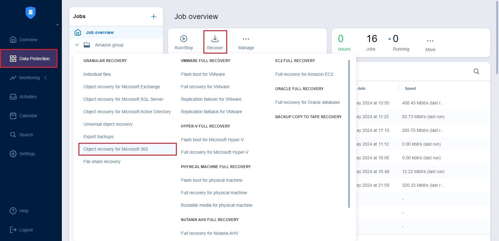 Inicio de la recuperación de objetos para Microsoft 365 desde el menú de protección de datos