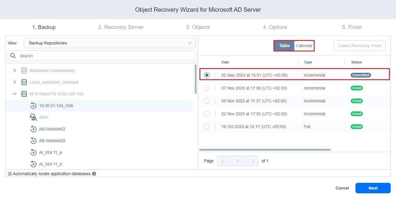 1. En la página Backup del asistente, seleccione una copia de seguridad de una máquina virtual con el servidor de Microsoft Active Directory mediante la vista Repositorios de backups o Jobs & Groups del panel izquierdo.