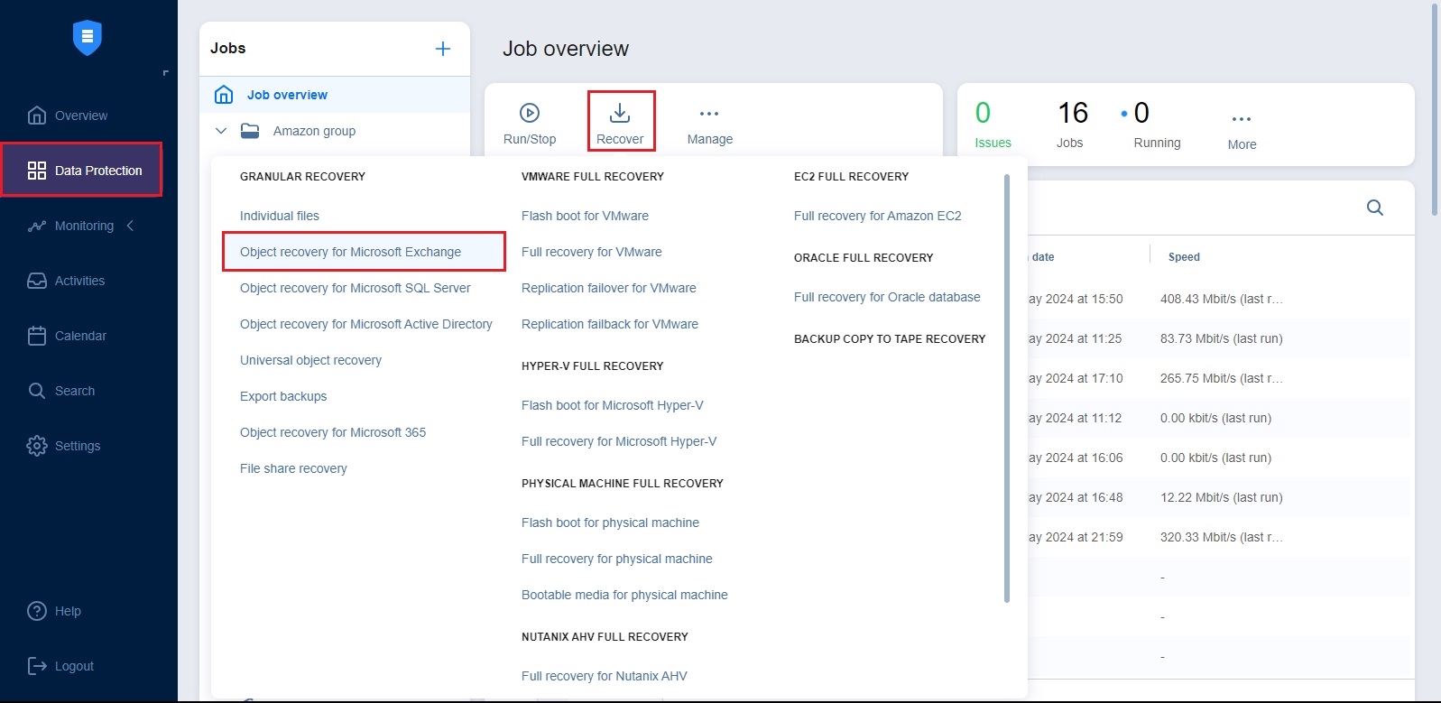 Para iniciar la recuperación de objetos para Microsoft Exchange, desde el menú Protección de datos, haga clic en Recuperar y, a continuación, en Recuperación de objetos para Microsoft Exchange.