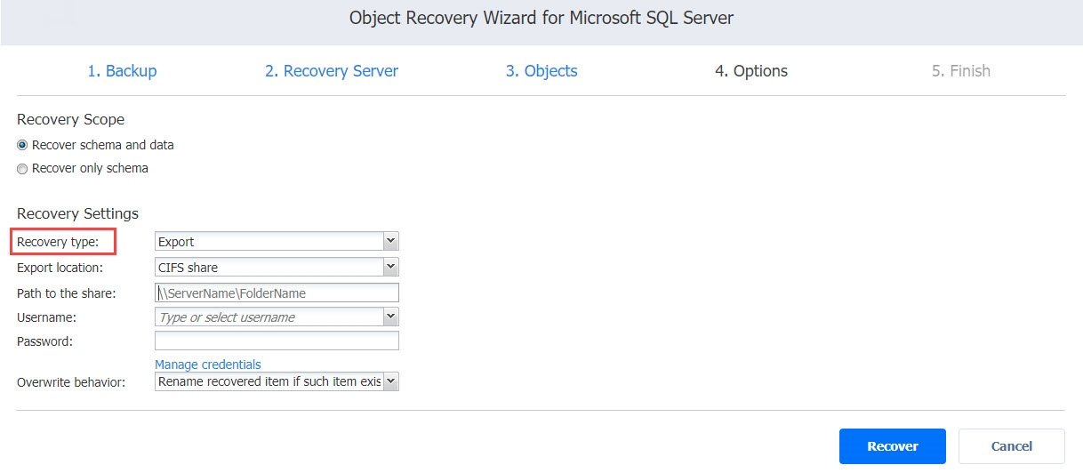 Establezca el ámbito de recuperación seleccionando Recuperar esquema y datos o Recuperar sólo esquema.