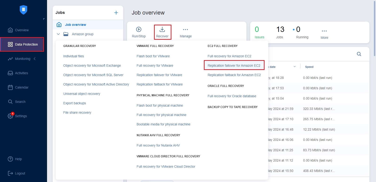 Para iniciar el procedimiento de conmutación de una carga de trabajo del sistema Amazon EC2 a una instancia de EC2 de backup, haga clic en Recover (Recuperar) en el menú Data Protection (Protección de datos ) y, a continuación, haga clic en Replication failover for Amazon EC2 (Conmutación por error de replicación de instancias de Amazon EC2 ) en la sección EC2 Full Recovery (Recuperación completa de EC2 ).