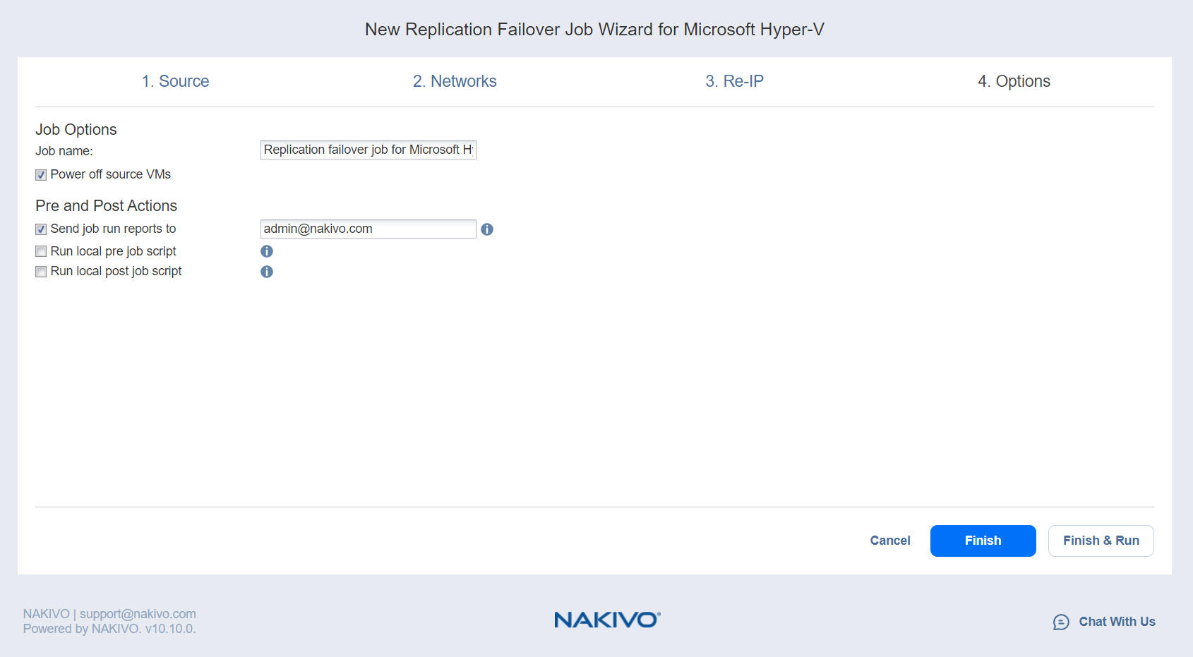 1. enviar los informes de ejecución del job a: Cuando se selecciona esta opción, se envía un informe de jobs a los destinatarios especificados cada vez que finaliza el job de conmutación por recuperación. Esta opción anula el ajuste por defecto en los ajustes de NAKIVO Backup & Replication.