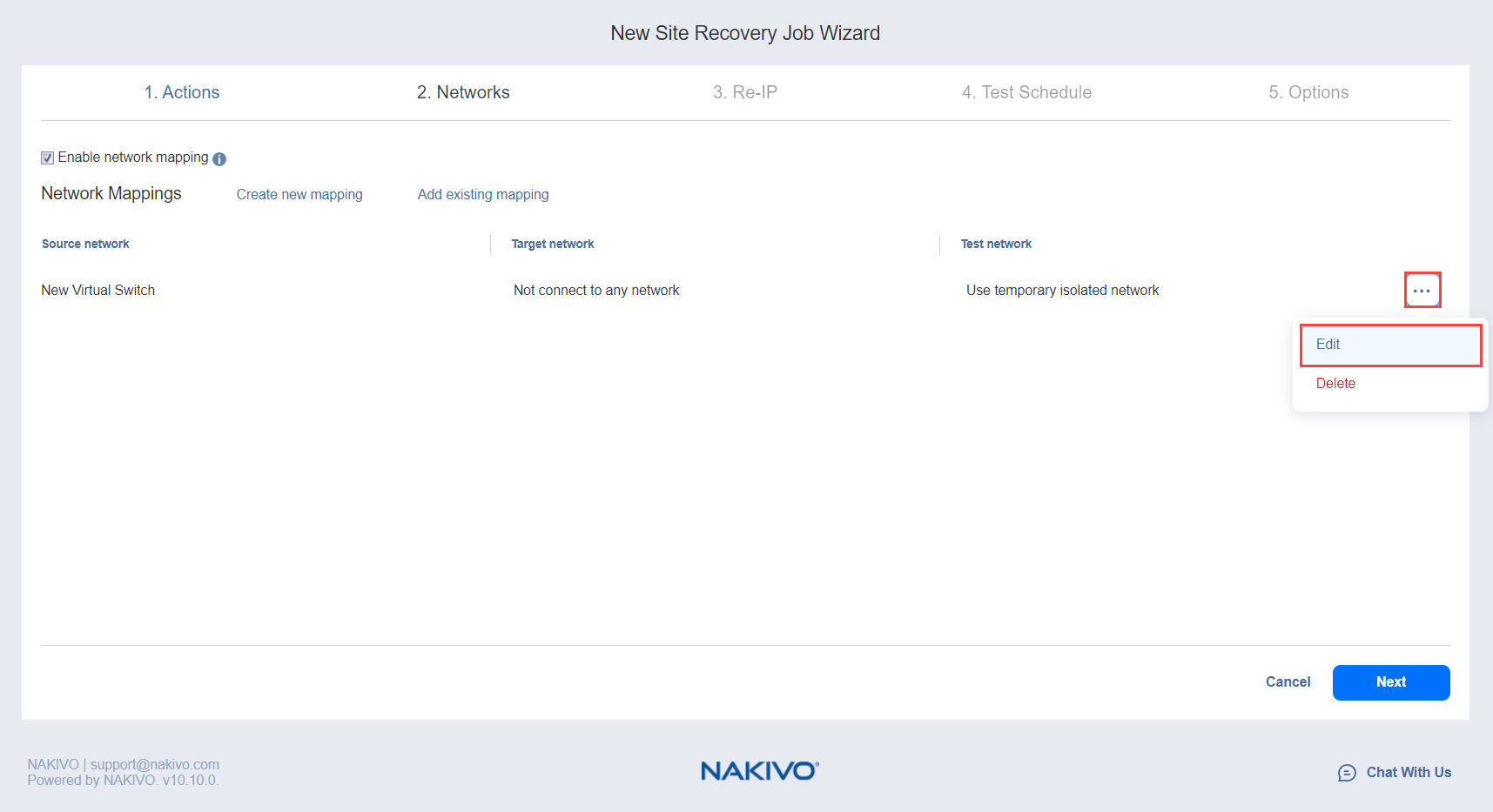 Para poder activar el mapeo de la red para su job de restauración del entorno, es necesario que haya una acción de conmutación por error o de restauración por error en la lista de acciones.