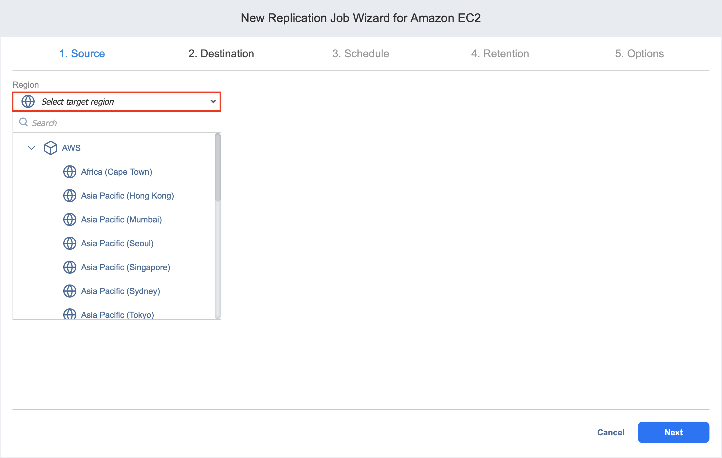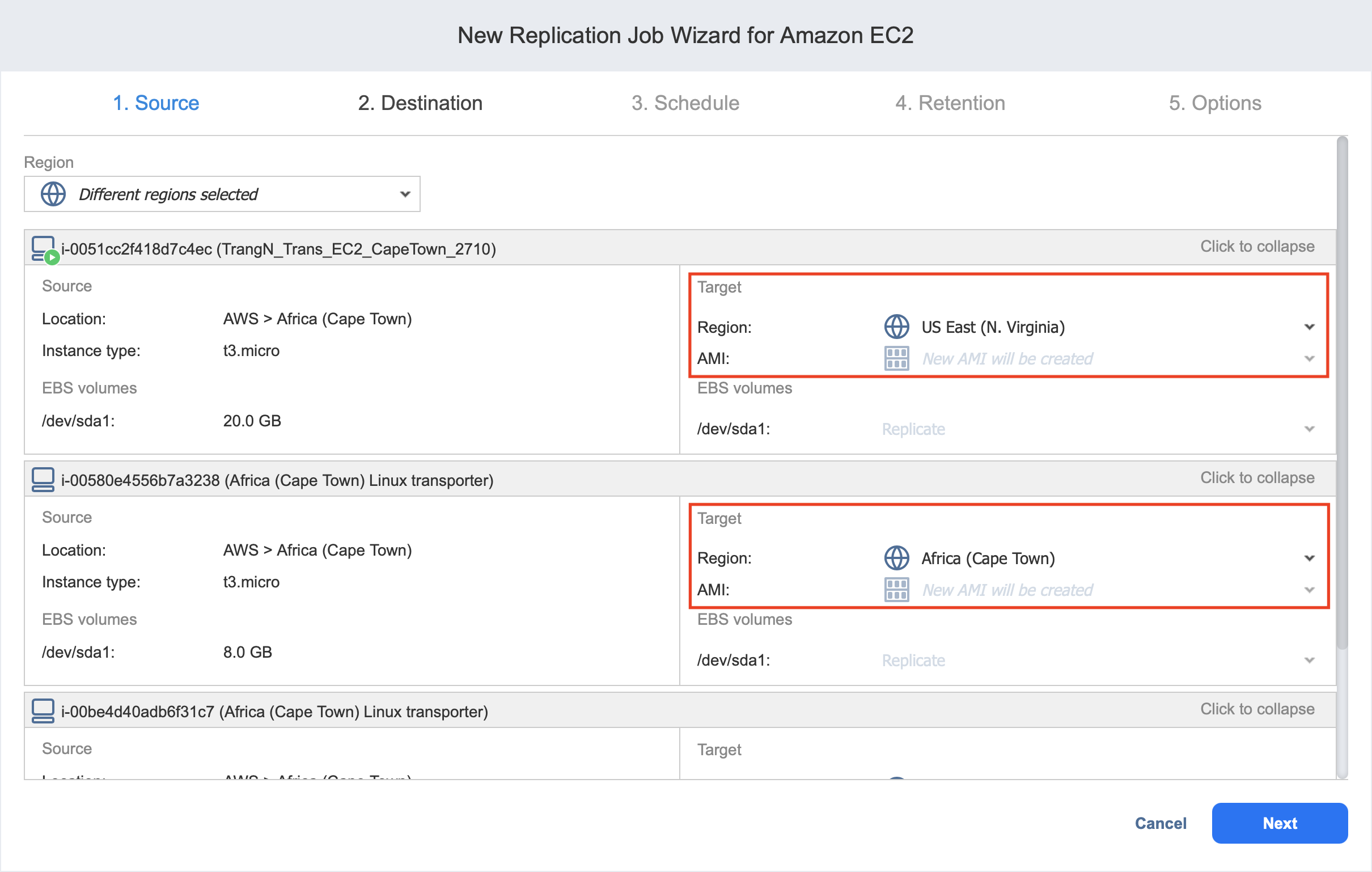 Para replicar todas las instancias de Amazon EC2 en la misma región, seleccione una región de destino en la lista desplegable Región .