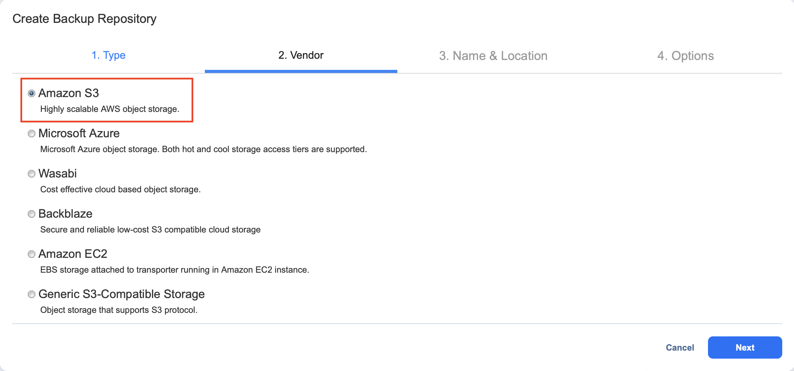 En la página Tipo del asistente Crear repositorios de backups, seleccione Nube & Almacenamiento compatible con S3 y haga clic en Siguiente para ir a la página siguiente del asistente.