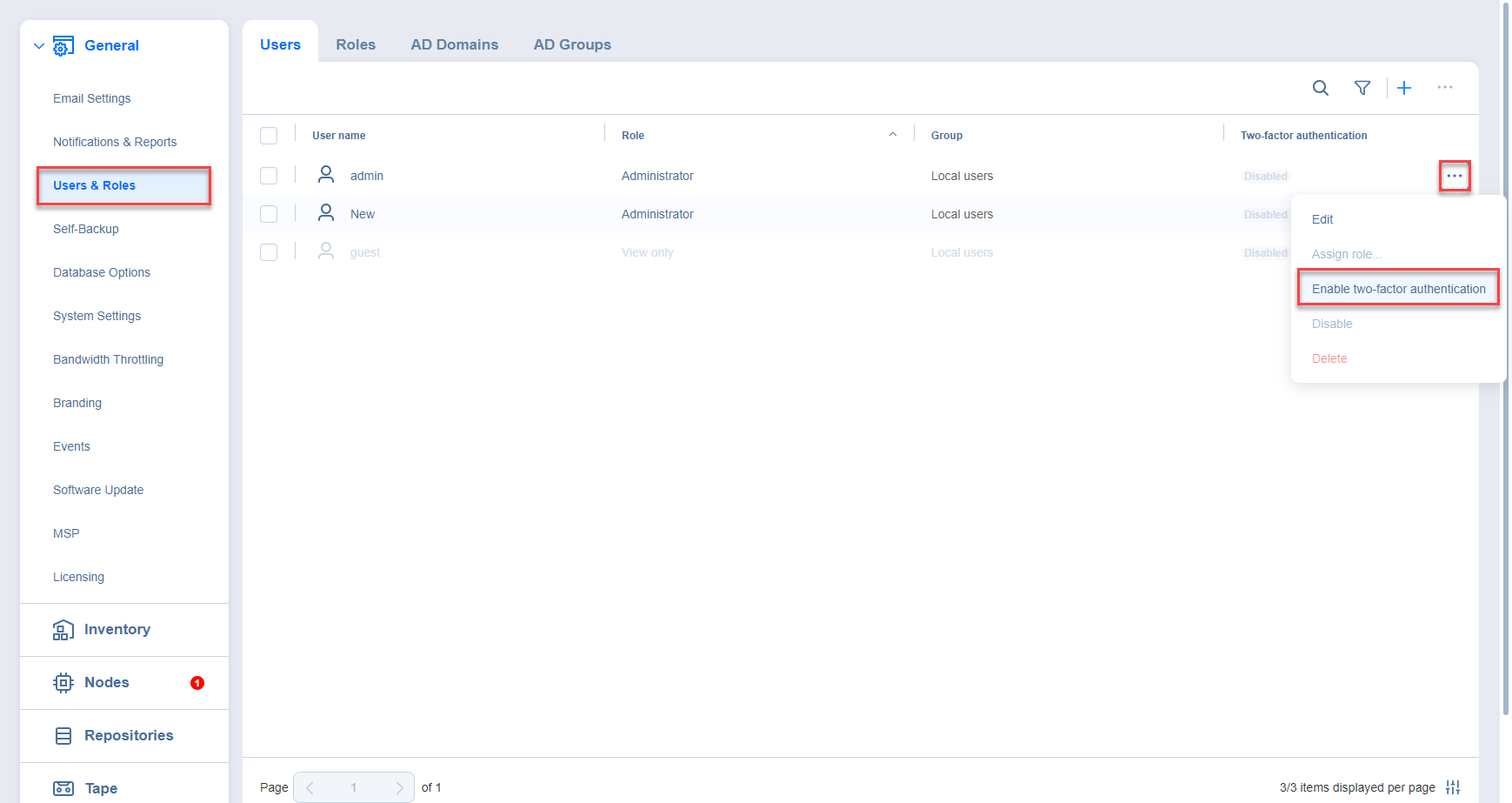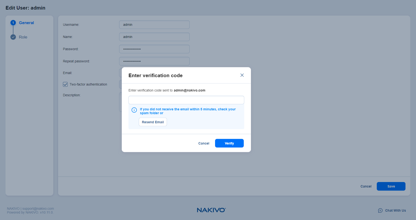 Los usuarios sin rol de administrador ni permiso de configuración sólo pueden configurar la autenticación de dos factores en la pantalla de inicio de sesión de NAKIVO Backup & Replication.