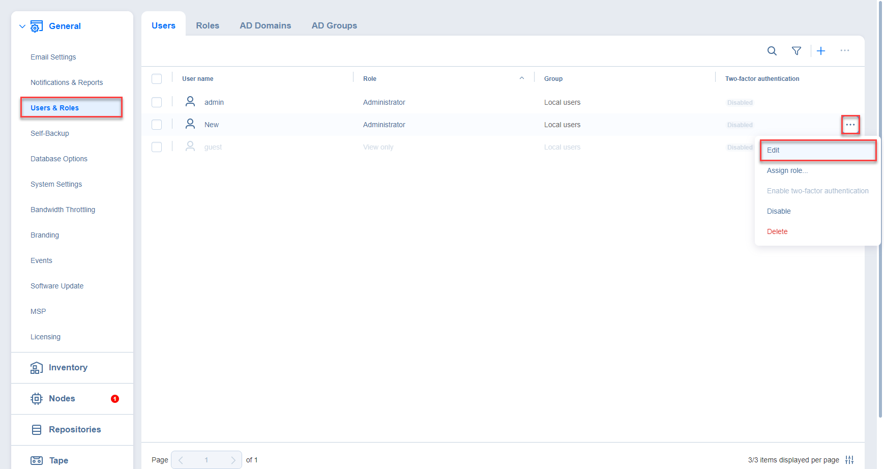 2. La página Usuarios & Roles se abre en la vista Usuarios. En la lista de usuarios, realice una de las siguientes acciones: