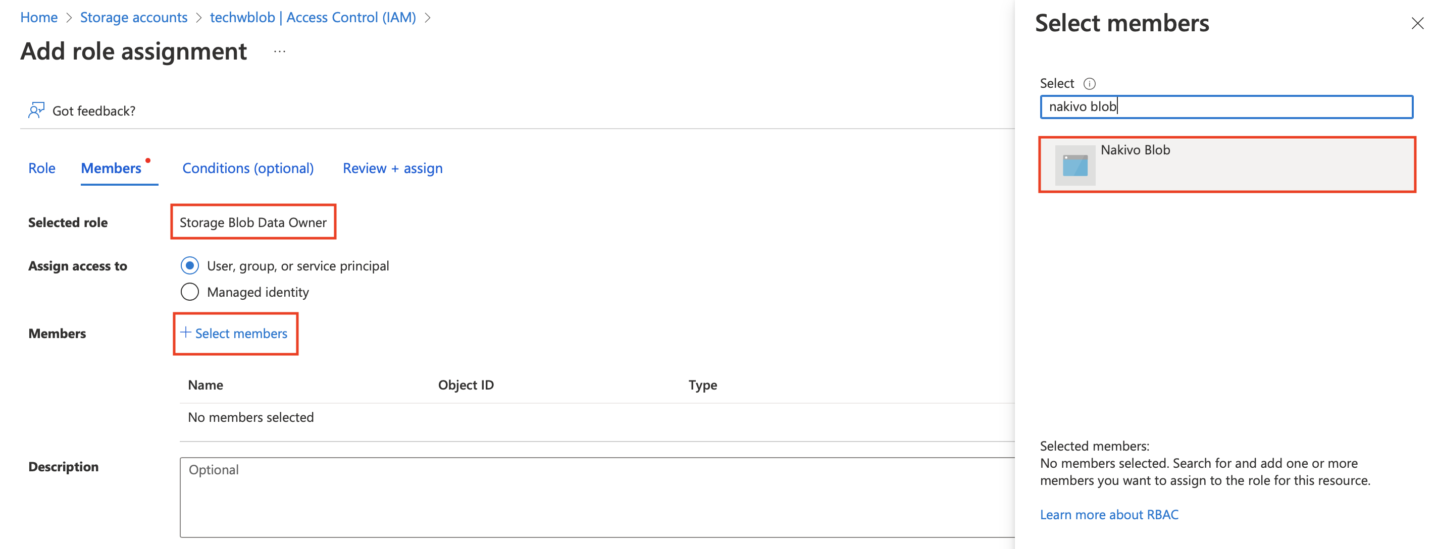 Busque el rol Propietario de Datos de Blob de Almacenamiento y selecciónelo. Haga clic en Siguiente.