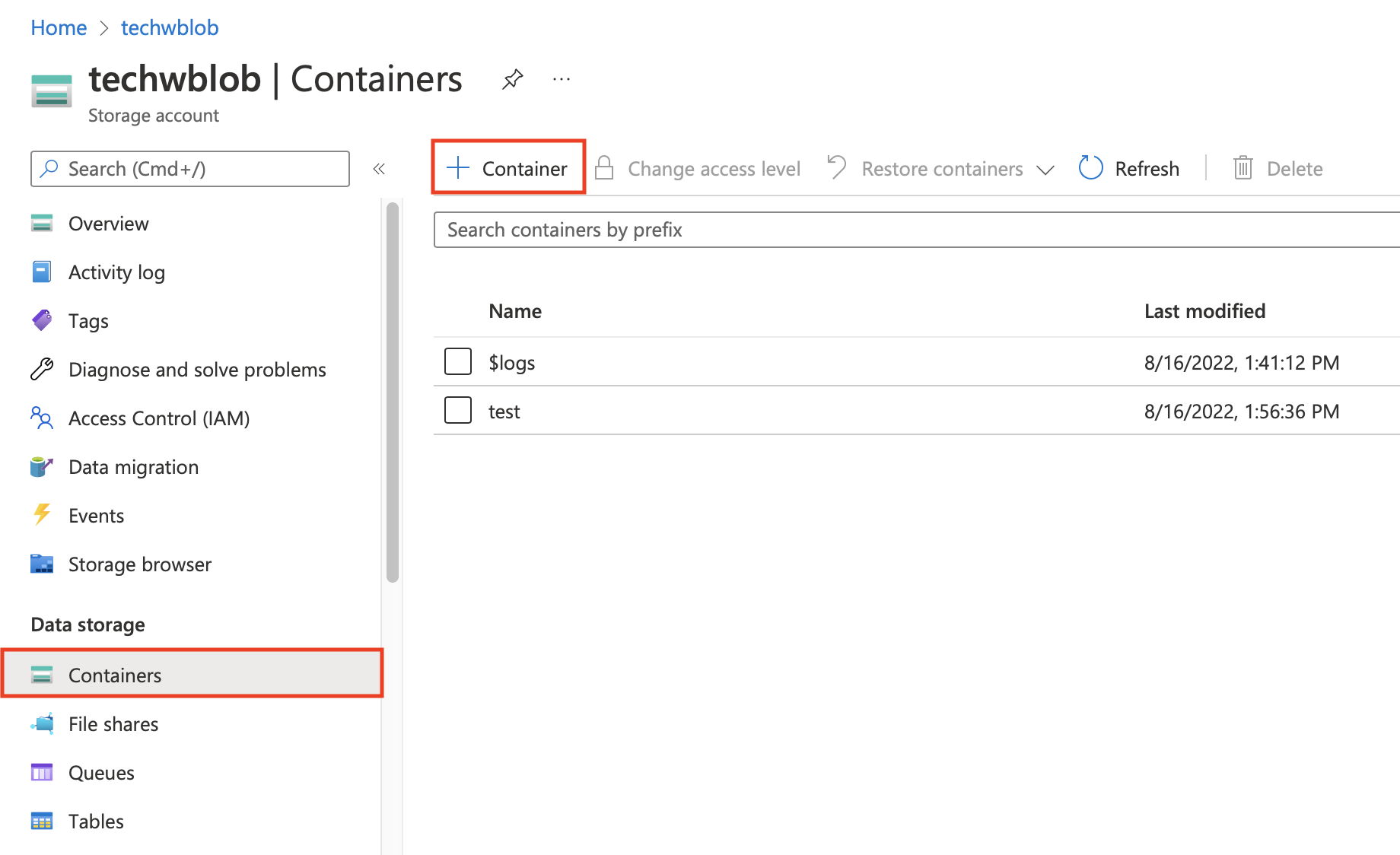 Para añadir contenedores de almacenamiento a la cuenta de almacenamiento y configurar la inmutabilidad, vaya a la pestaña Contenedores y haga clic en + Contenedor.