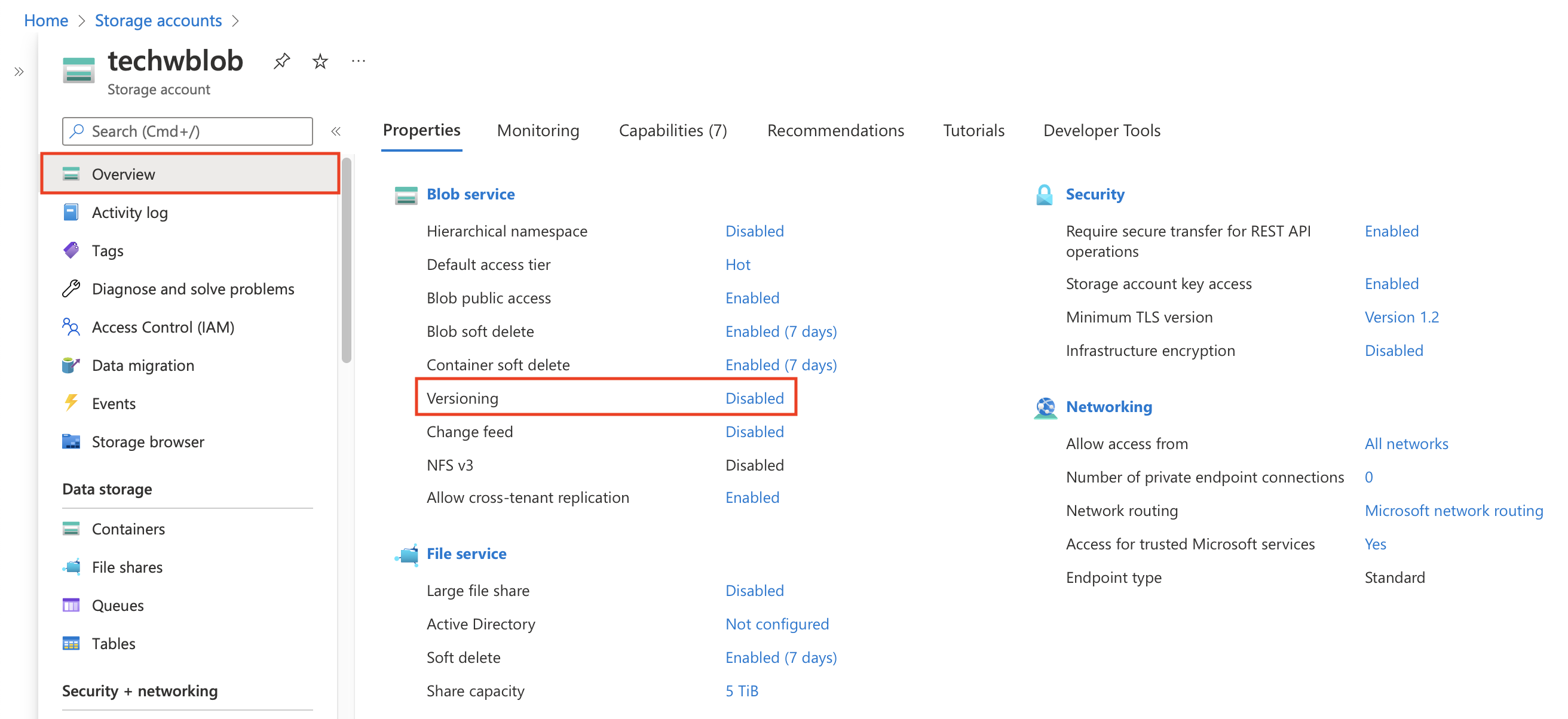 Si ha activado la compatibilidad con la inmutabilidad a nivel de versión en cualquiera de los pasos anteriores, asegúrese también de que el control de versiones para blobs está activado. Vuelva al menú Descripción general de la cuenta de almacenamiento y desplácese hacia abajo hasta encontrar Control de versiones en la pestaña Propiedades. Si el control de versiones está desactivado, haga clic en Desactivado.