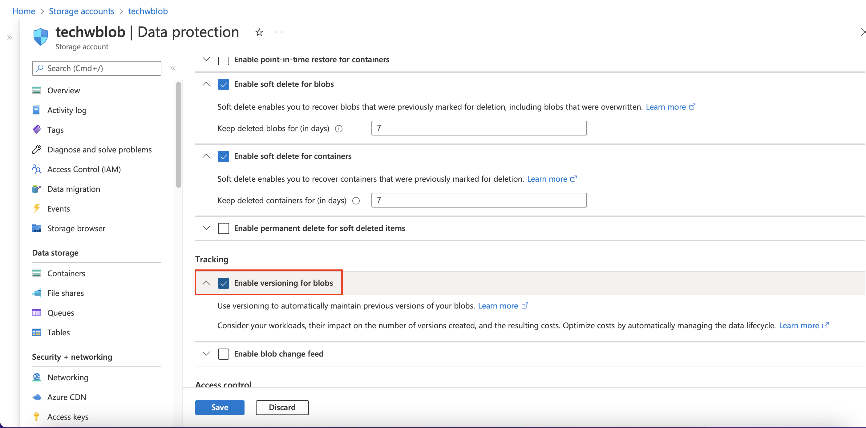 Desplácese hacia abajo para encontrar Activar control de versiones para blobs en Seguimiento. Active esta función y haga clic en Guardar.