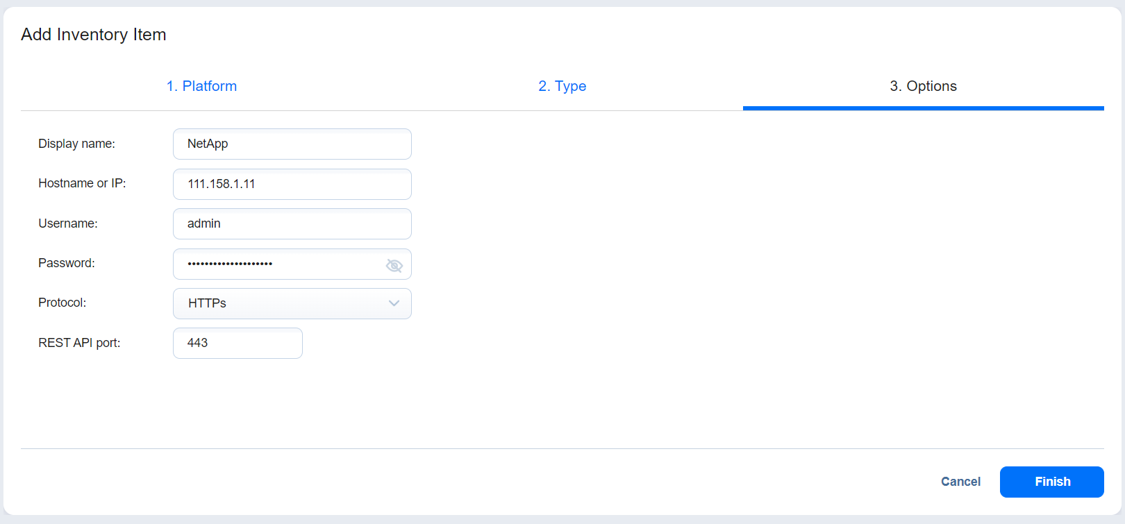 • Contraseña: proporcione una contraseña para el dispositivo de almacenamiento NetApp.