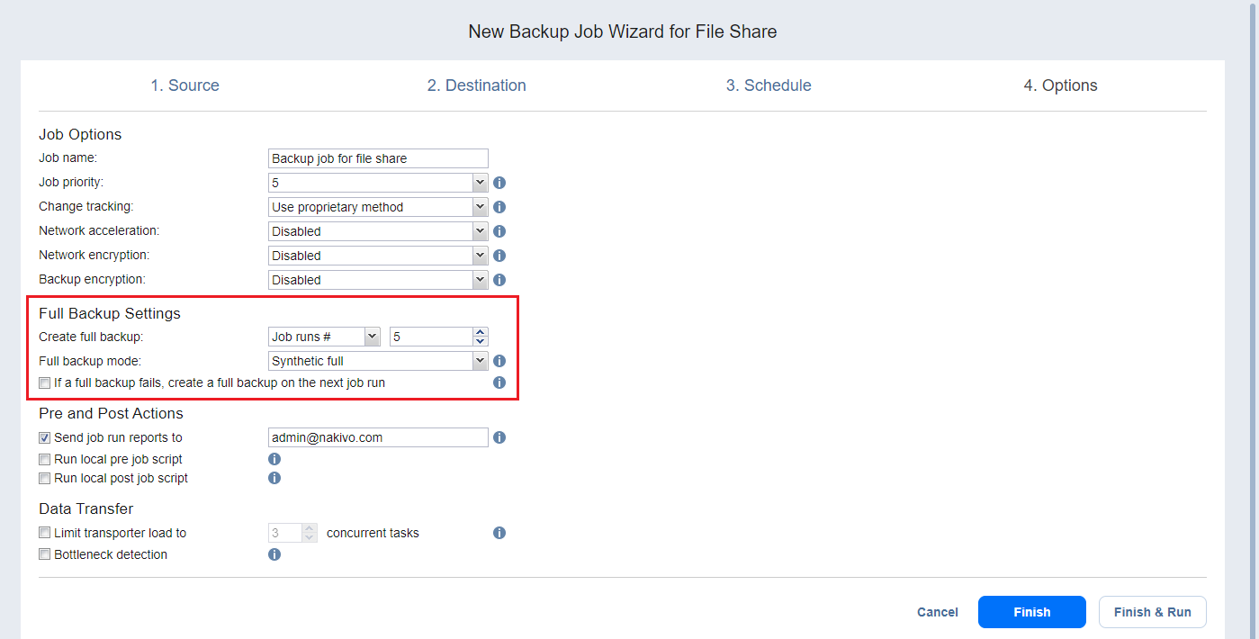 Si falla un backup completo, crear un backup completo en la siguiente ejecución del job: Con esta opción seleccionada, la siguiente ejecución de job crea una copia de seguridad completa si falla la ejecución del job actual.