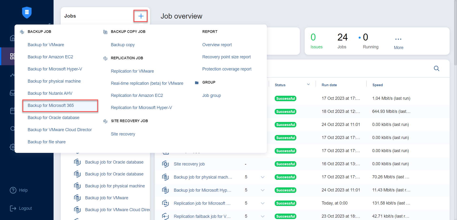 Para crear un job de backups, haga clic en el botón más + del menú Protección de datos y, a continuación, haga clic en Backup de Microsoft 365.