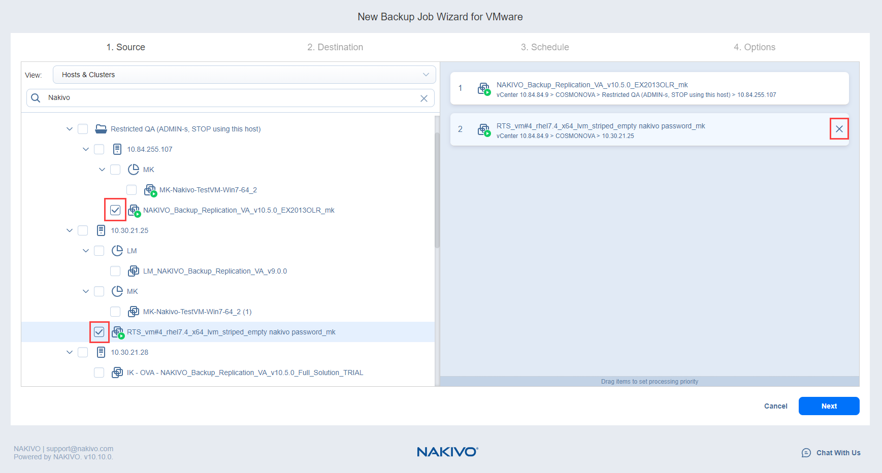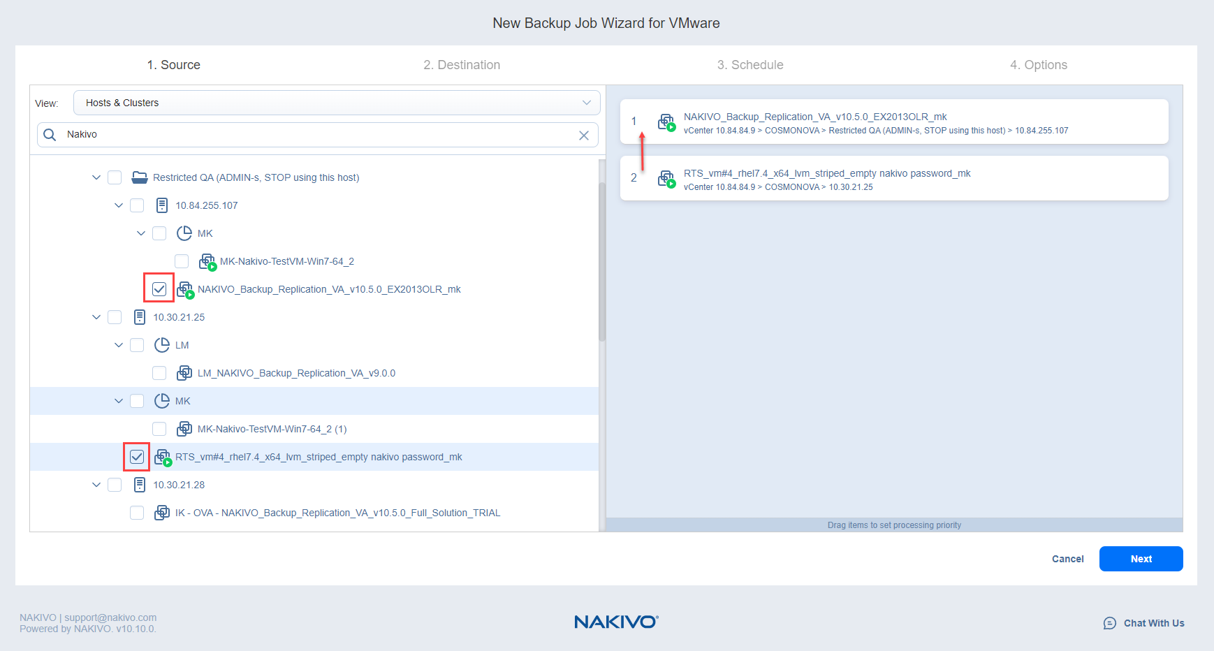 Los elementos seleccionados aparecen en el panel derecho de la página. Puede arrastrar una máquina virtual o un contenedor con el puntero a una nueva posición para reordenar los elementos seleccionados. Haciendo esto, puedes especificar hacer backup de las máquinas virtuales más importantes primero.