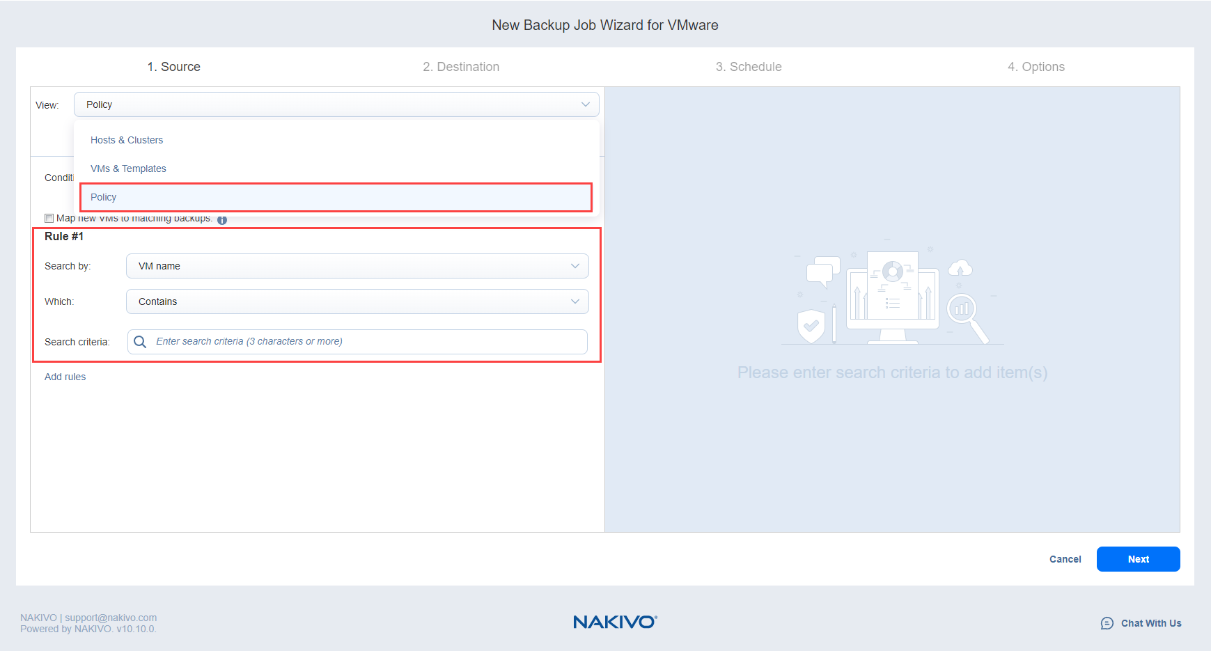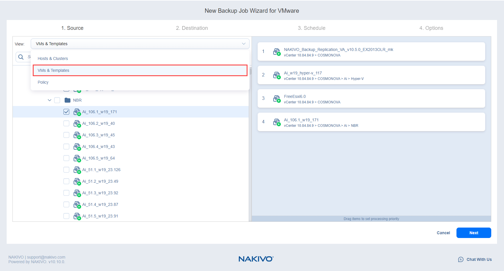 En la página de origen del asistente, puede añadir máquinas virtuales de VMware a su job de backups utilizando una de las vistas de inventario. Proceda como se describe en las secciones siguientes: