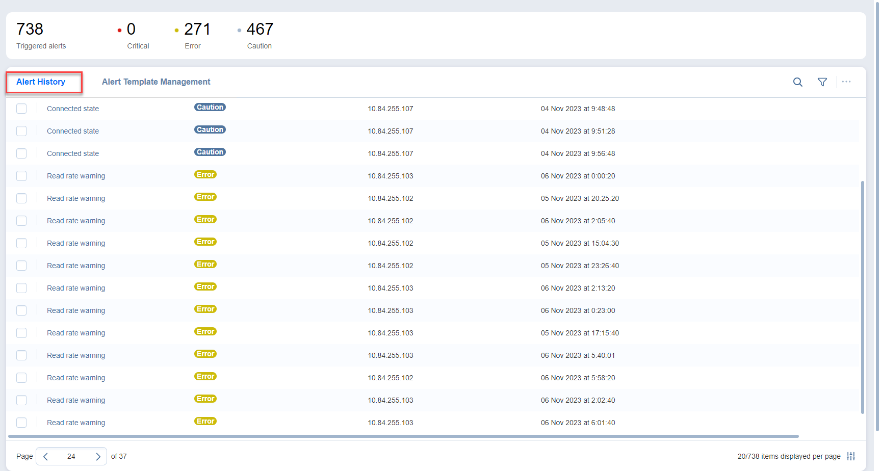 La pestaña Historial de alertas muestra la lista de alertas activadas. Cuando se cumplen las reglas de una plantilla de alerta activada, se activa la alerta configurada y se muestra en la lista.