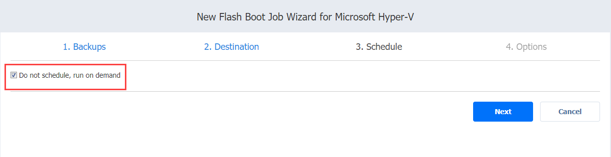 Si desea iniciar el job sólo manualmente (sin ninguna programación), seleccione la casilla de verificación No programar, ejecutar bajo demanda y haga clic en Siguiente.