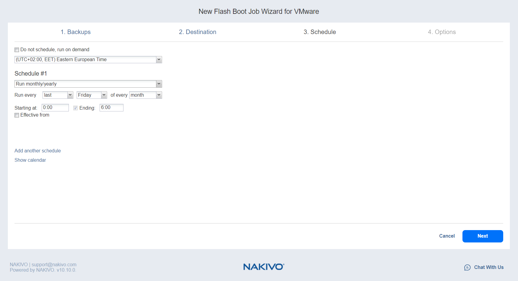 En la páginaProgramar del asistente, seleccione si desea ejecutar el job de recuperación manualmente o programar el job para que se ejecute de forma periódica. Proceda como se describe en las secciones siguientes: