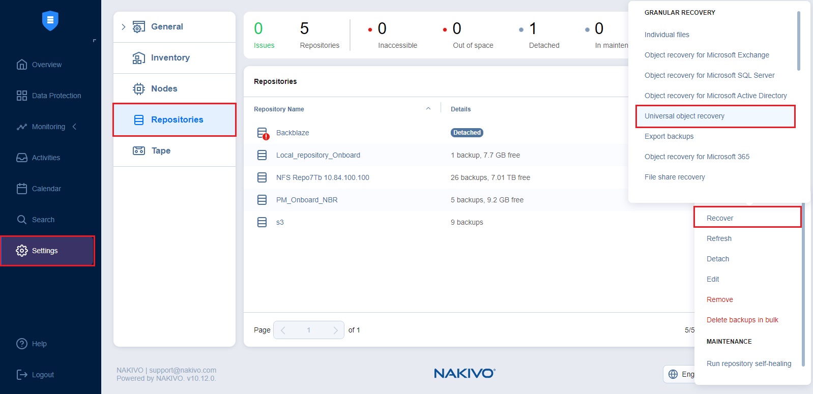 Puedes iniciar el proceso de recuperación desde el menú Protección de datos, utilizando la función Buscar, o desde la página Repositorios en Configuración (por ejemplo, si ya no tienes un job de backup pero aún conservas la copia de seguridad). Consulte las secciones siguientes para obtener más detalles: