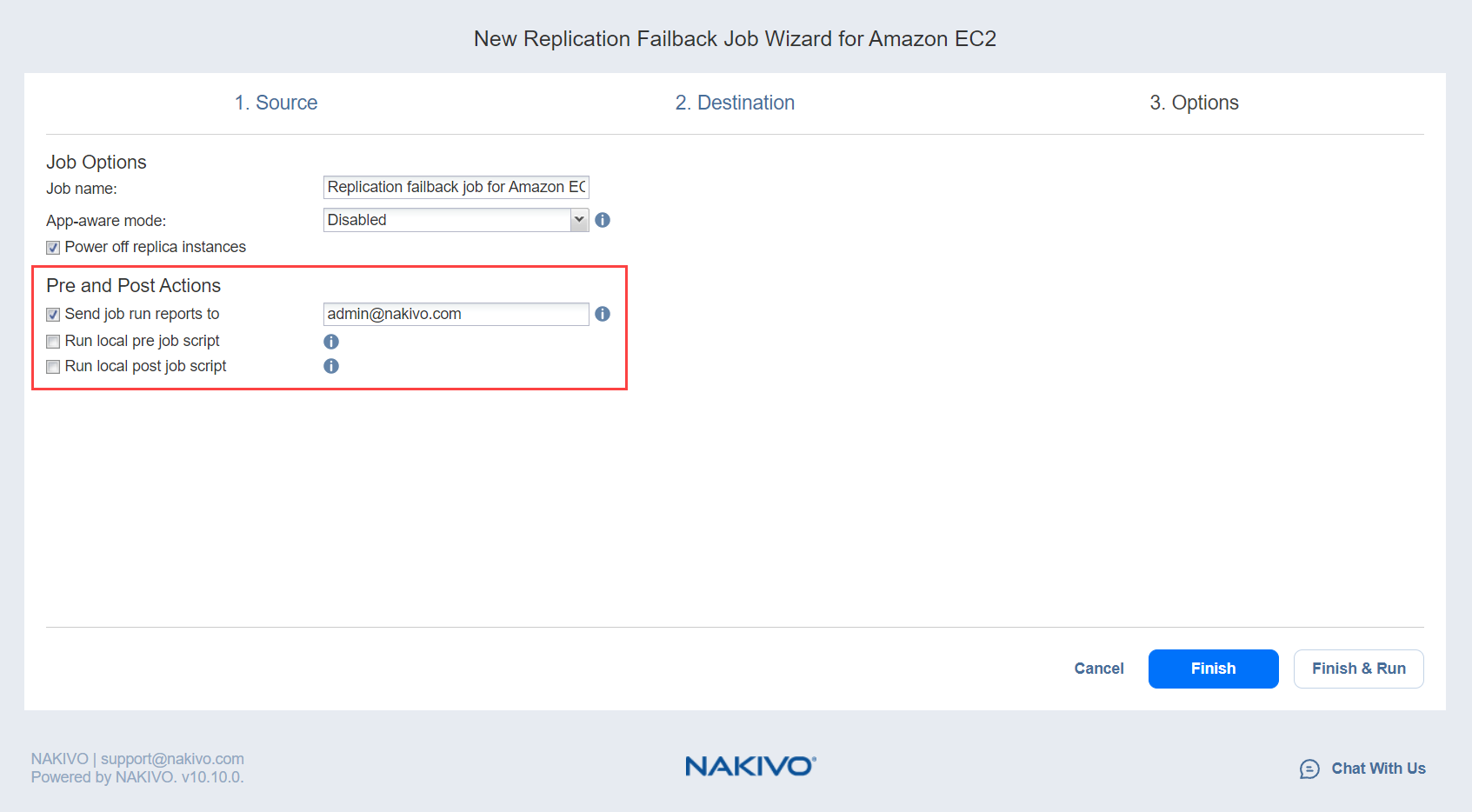 1. enviar los informes de ejecución del job a: Cuando se selecciona esta opción, se envía un informe de jobs a los destinatarios especificados cada vez que finaliza la conmutación por error. Esto anula el ajuste predeterminado especificado en los ajustes de NAKIVO Backup & Replication.