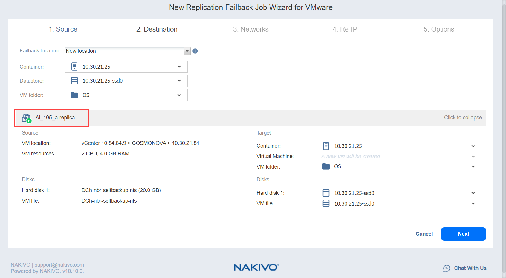 Asistente de Job de conmutación por error para VMware: Destino