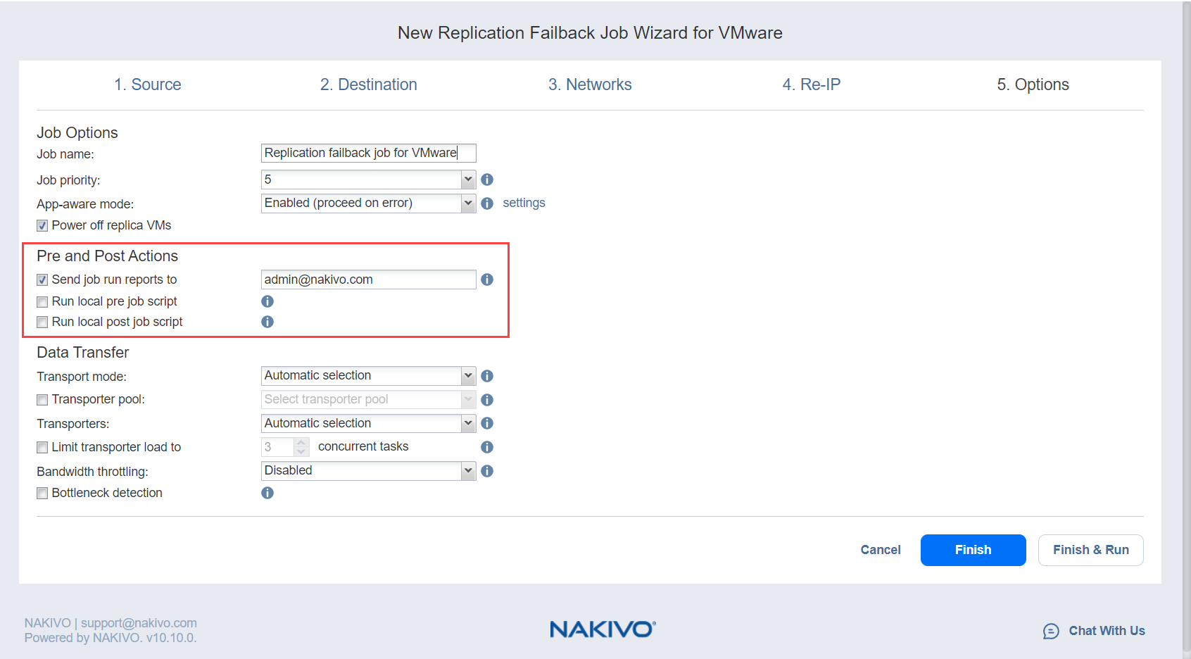 enviar los informes de ejecución del job a: Cuando se selecciona esta opción, se envía un informe de jobs a los destinatarios especificados cada vez que finaliza la conmutación por error. Esto anula los ajustes predeterminados del panel de control de NAKIVO Backup & Replication Settings.