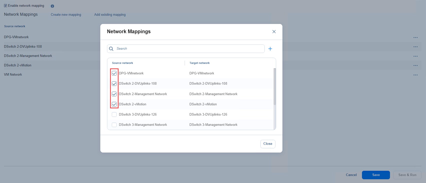 2. Se abre el cuadro de diálogo Añadir nuevo mapeo de red. Elija una red de origen y una red de destino y haga clic en Guardar.