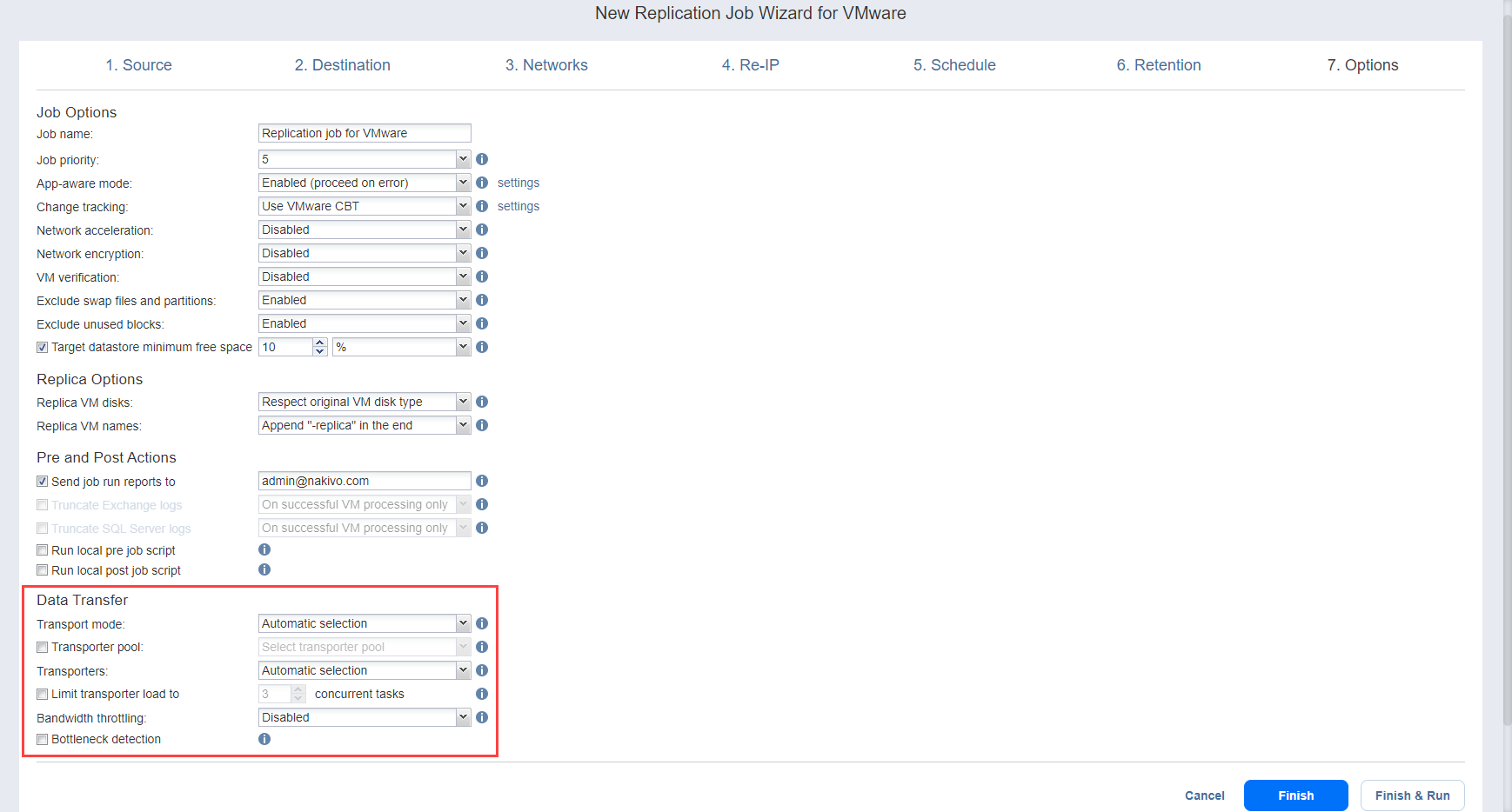 En esta sección, puede especificar un nombre y un nivel de prioridad para su trabajo de replicación, y activar/desactivar el modo App-aware, el seguimiento de cambios, la aceleración de la red, el cifrado, la verificación de la máquina virtual y la exclusión de archivos de intercambio, particiones y bloques no utilizados.