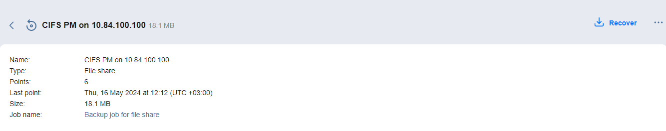 Al hacer click en el nombre de un backups se abre la página de detalles del backup donde puedes ver la información del backup y ver todos los puntos de recuperación disponibles para este backup.