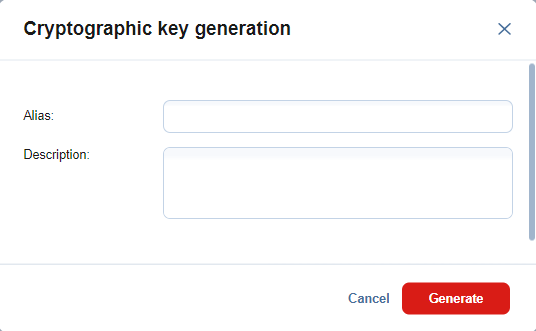 2. En el cuadro de diálogo que aparece, introduzca el alias y su descripción (opcional) y haga clic en Generar para iniciar la generación de una nueva clave criptográfica simétrica en la cuenta especificada. Para más detalles, consulte la página AWS::KMS::Alias. Pulse el botón Cancelar o X para cerrar el cuadro de diálogo sin aplicar ningún cambio.