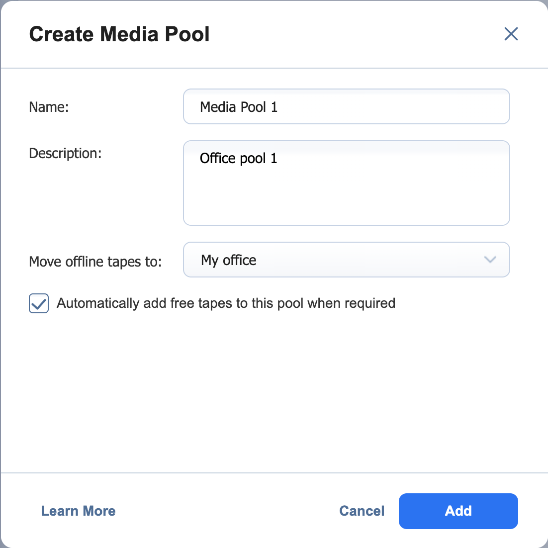 Seleccione la casilla de verificación Añadir automáticamente cintas libres a esta reserva cuando sea necesario para añadir automáticamente uno de los cartuchos de cinta disponibles vacíos a esta reserva de cintas si la reserva de cintas no tiene cartuchos de cinta disponibles.
