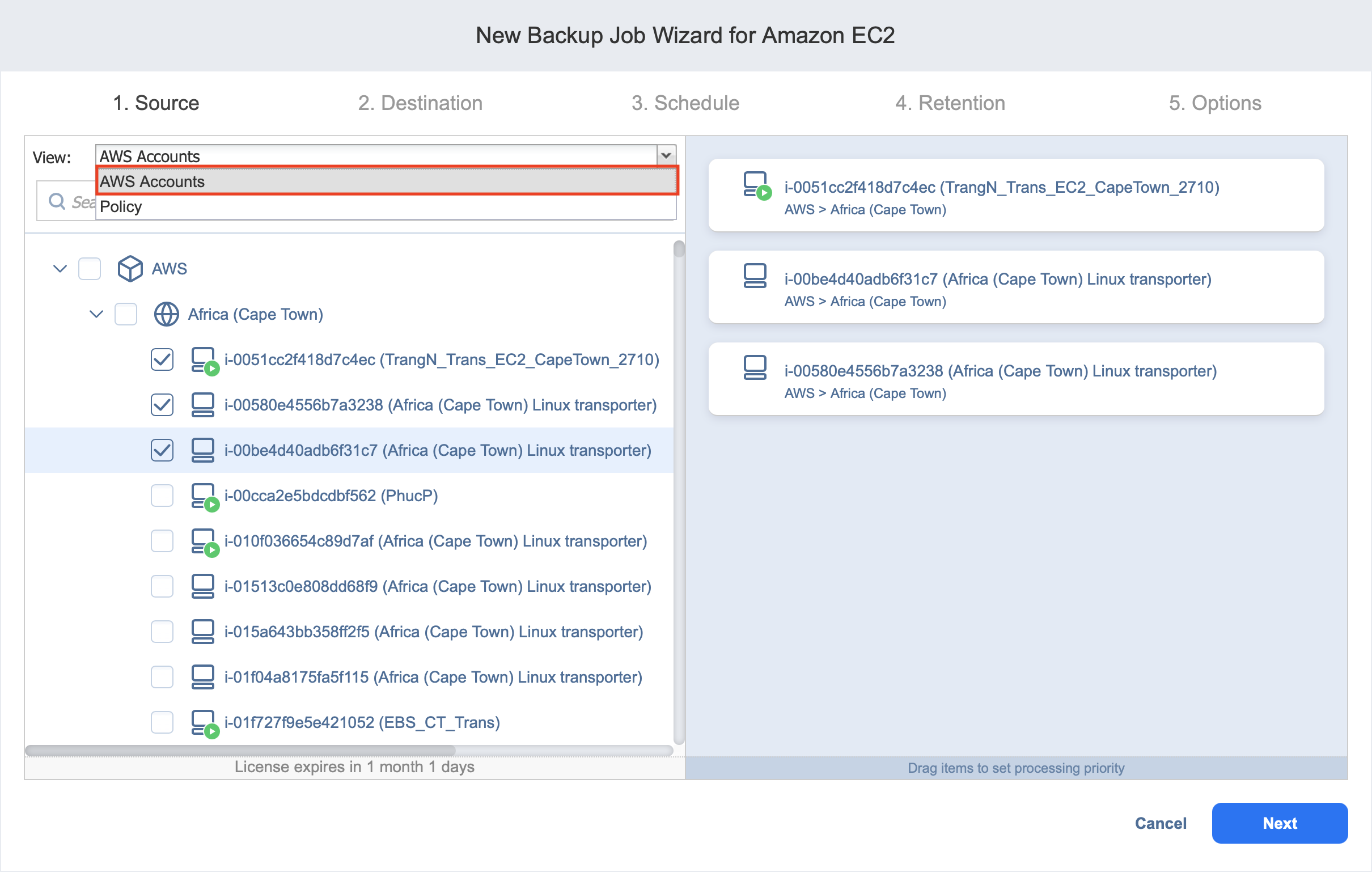 Haga clic en Siguiente para confirmar que desea añadir los elementos de EC2 seleccionados al job de backup.