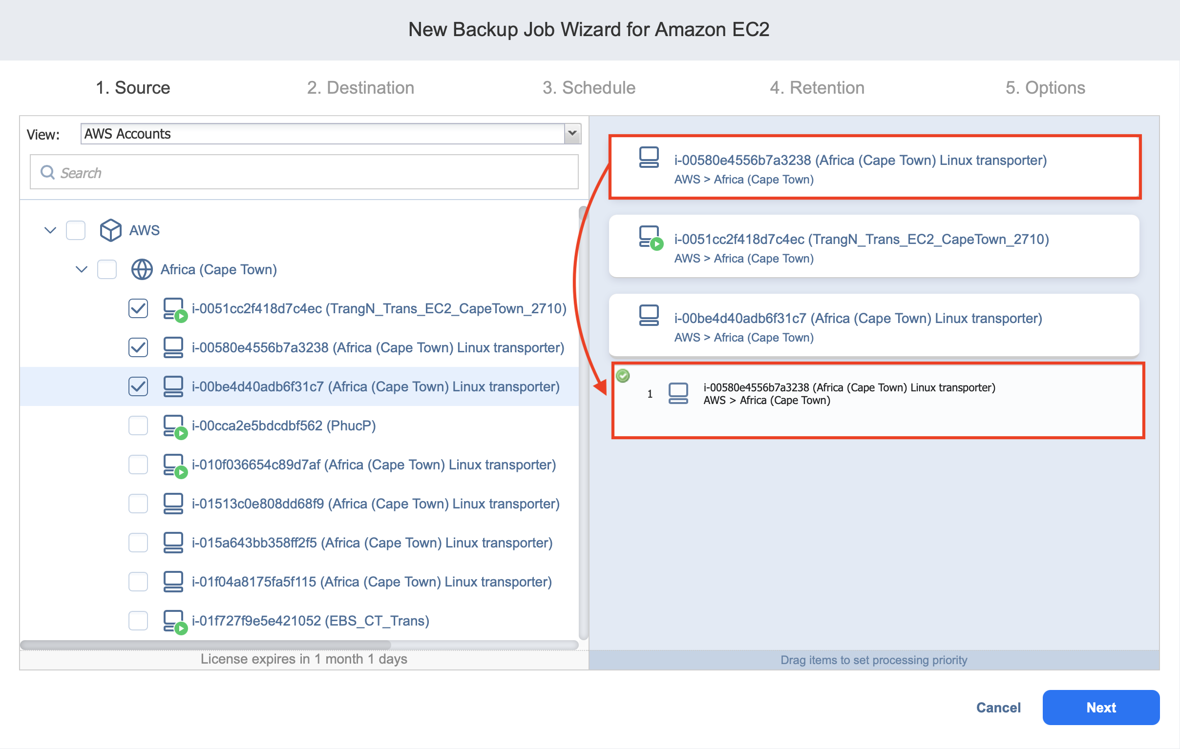 Los elementos seleccionados aparecen en el panel derecho de la página. Si es necesario, reordene los elementos seleccionados arrastrando una Instancia, Región o Cuenta a una nueva posición. De este modo, puede especificar que desea hacer backup primero de las instancias más importantes.