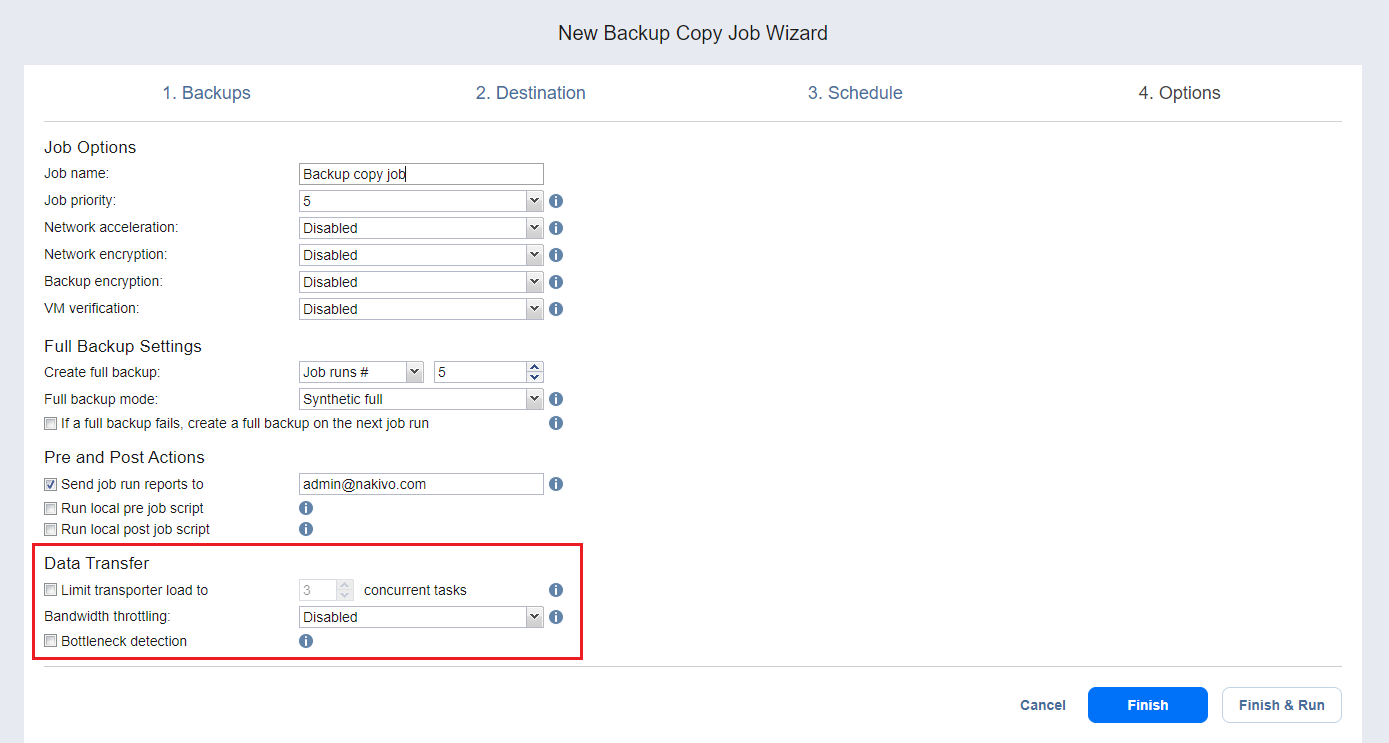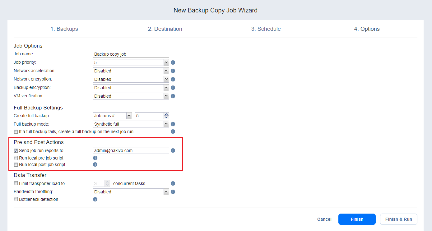 NAKIVO Backup & Replication permite configurar determinadas acciones antes de que comience un job de copia de backup y después de que haya finalizado. Puede elegir enviar los informes de ejecución del job al correo electrónico proporcionado y ejecutar script locales previo al job y posterior al job.