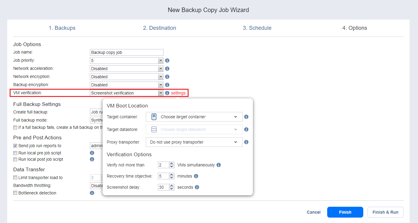 Verificación de inicio: Cuando se activa, todos los backups de la máquina virtual creados por el job se verifican de la siguiente manera. Después de completar la copia de seguridad de una máquina virtual, NAKIVO Backup & Replication recupera la máquina virtual utilizando el arranque Flash, desactiva las redes para evitar las conexiones de red y verifica que el inicio del sistema se ha realizado correctamente.