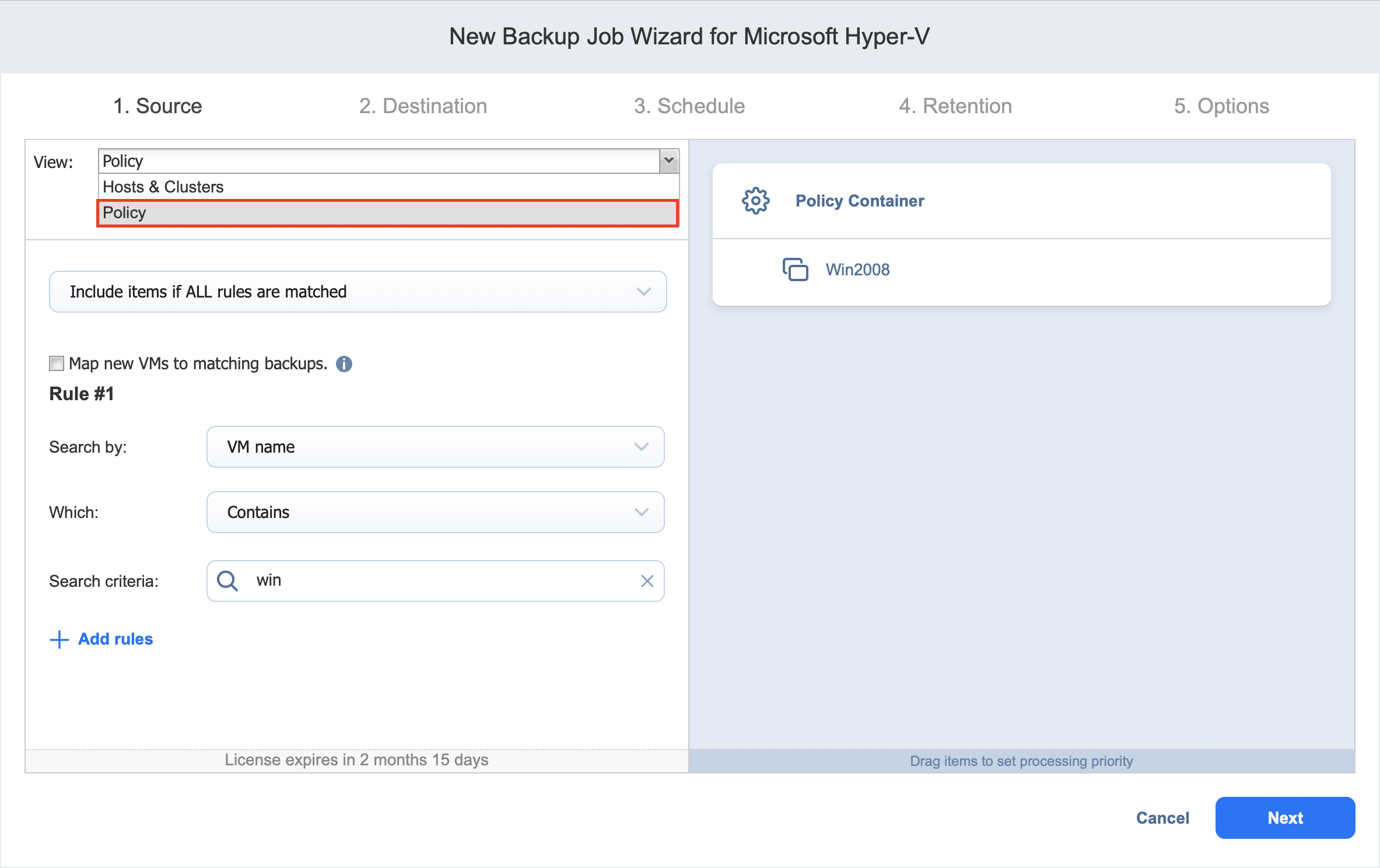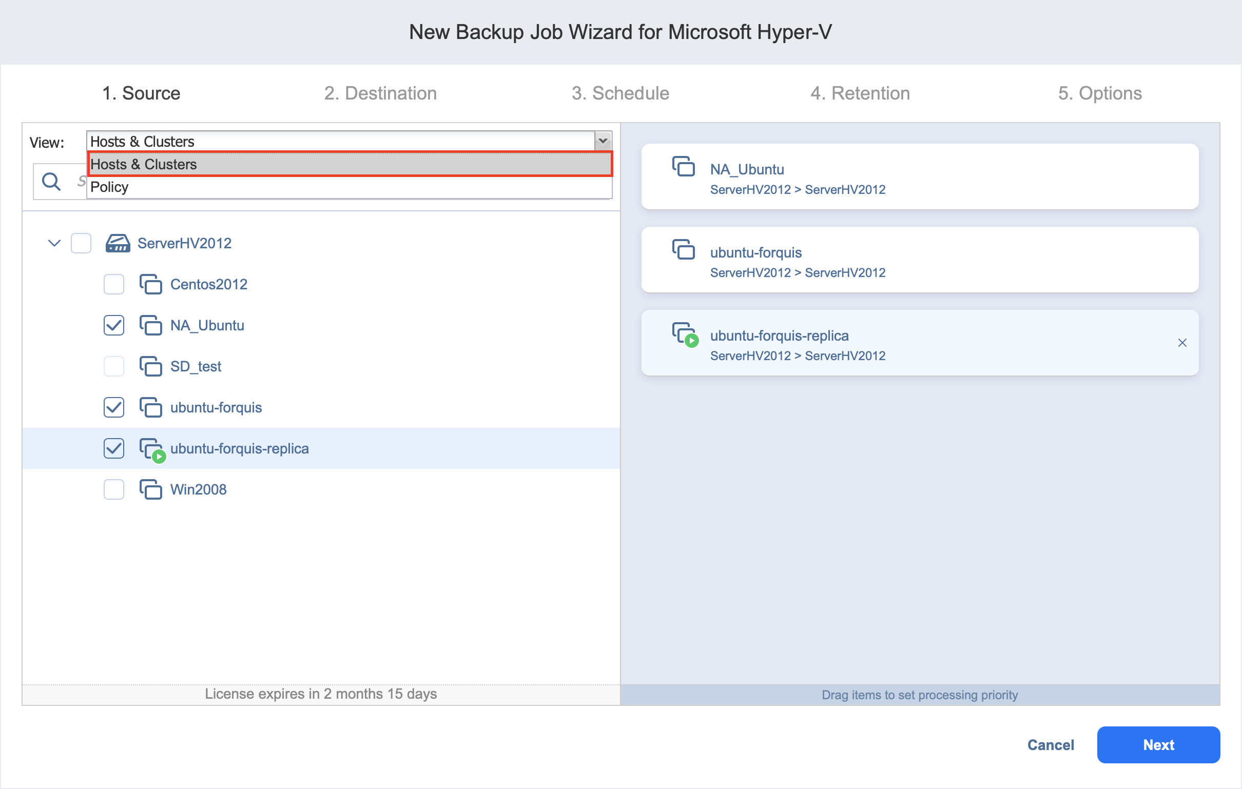 En la página de origen del asistente, puede añadir máquinas virtuales Hyper-V a su job de backups. Proceda como sigue: