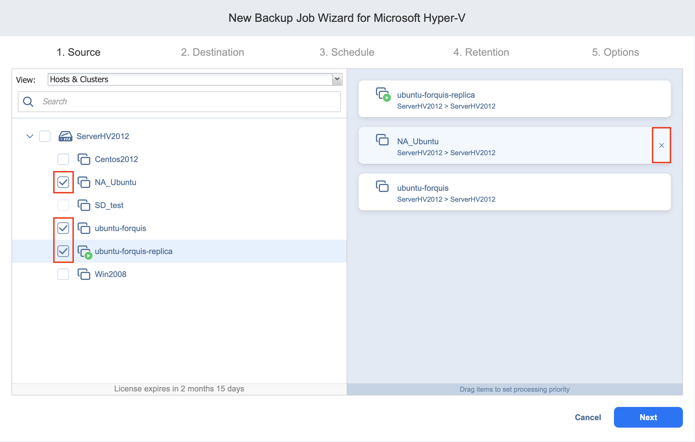 Los elementos seleccionados aparecen en el panel derecho de la página. Si es necesario, reordene los Elementos seleccionados arrastrando un VM o un contenedor a una nueva posición. De este modo, puede especificar que desea hacer backup de las máquinas virtuales más importantes en primer lugar.