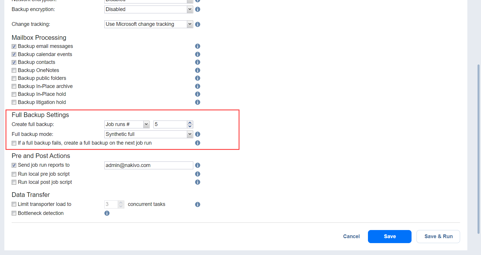 Usar el seguimiento de cambios de Microsoft: Con esta opción seleccionada, después de la ejecución inicial del trabajo, NAKIVO Backup & Replication utiliza las API de Microsoft para procesar exclusivamente los datos modificados de la última ejecución del trabajo. Esto permite aumentar considerablemente la velocidad de procesamiento.