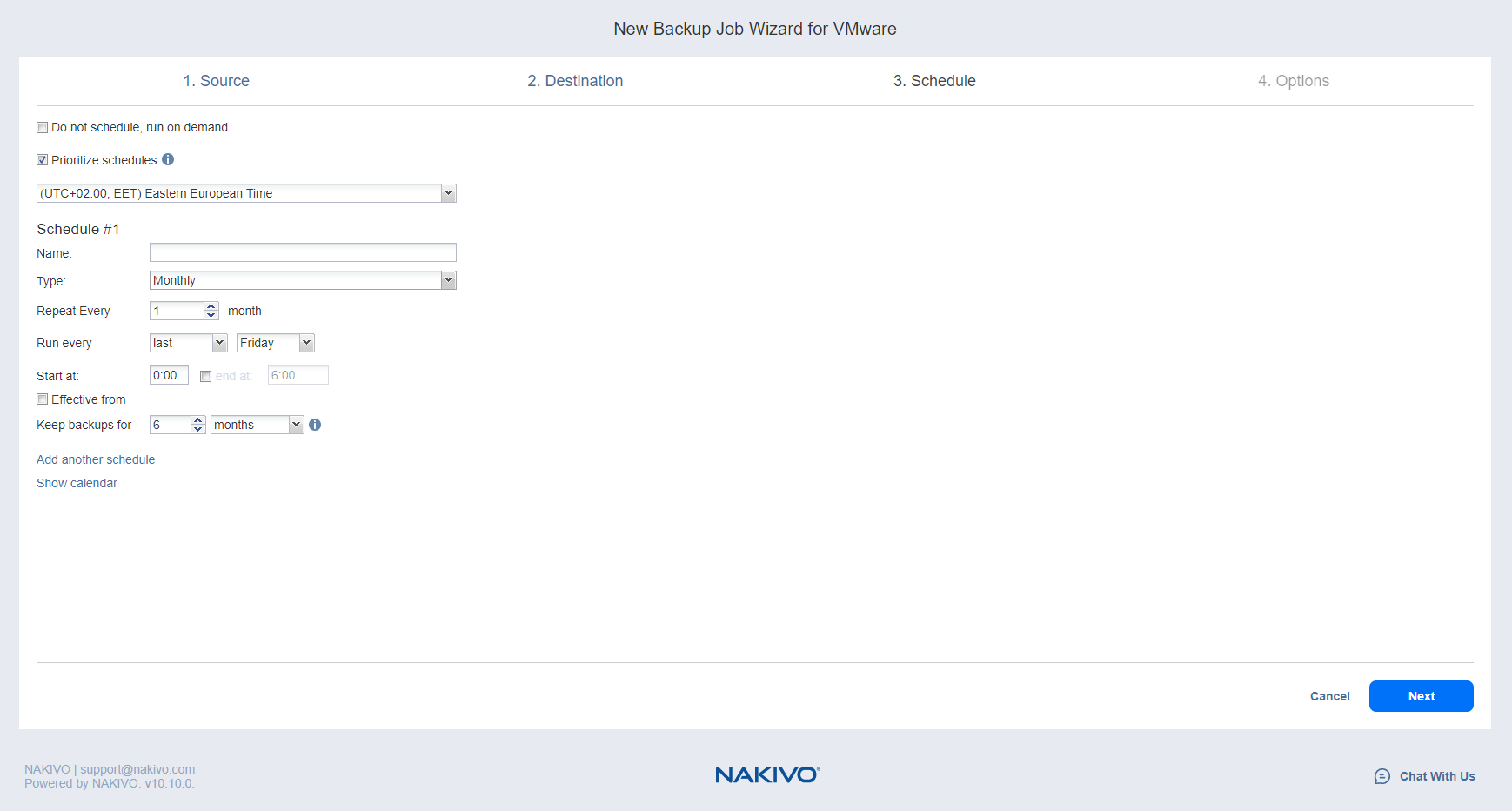 • Priorizar las programaciones: Cuando se selecciona esta opción, NAKIVO Backup & Replication empieza a tratar los horarios en función de su prioridad. La Programación Anual tendrá mayor prioridad que la Mensual, etc. En caso de que se solapen 2 o más programaciones, se omitirán las programaciones con menor prioridad.