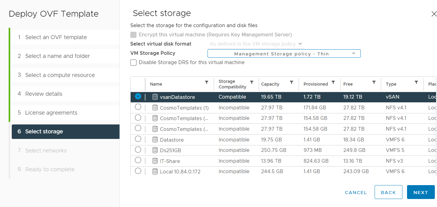 9. En la página Seleccionar almacenamiento, seleccione un almacén de datos en el que desee conservar el disco del appliance virtual, el formato del disco virtual( se recomiendaThin Provisioning ), la política de almacenamiento de la máquina virtual y haga clic en Siguiente.