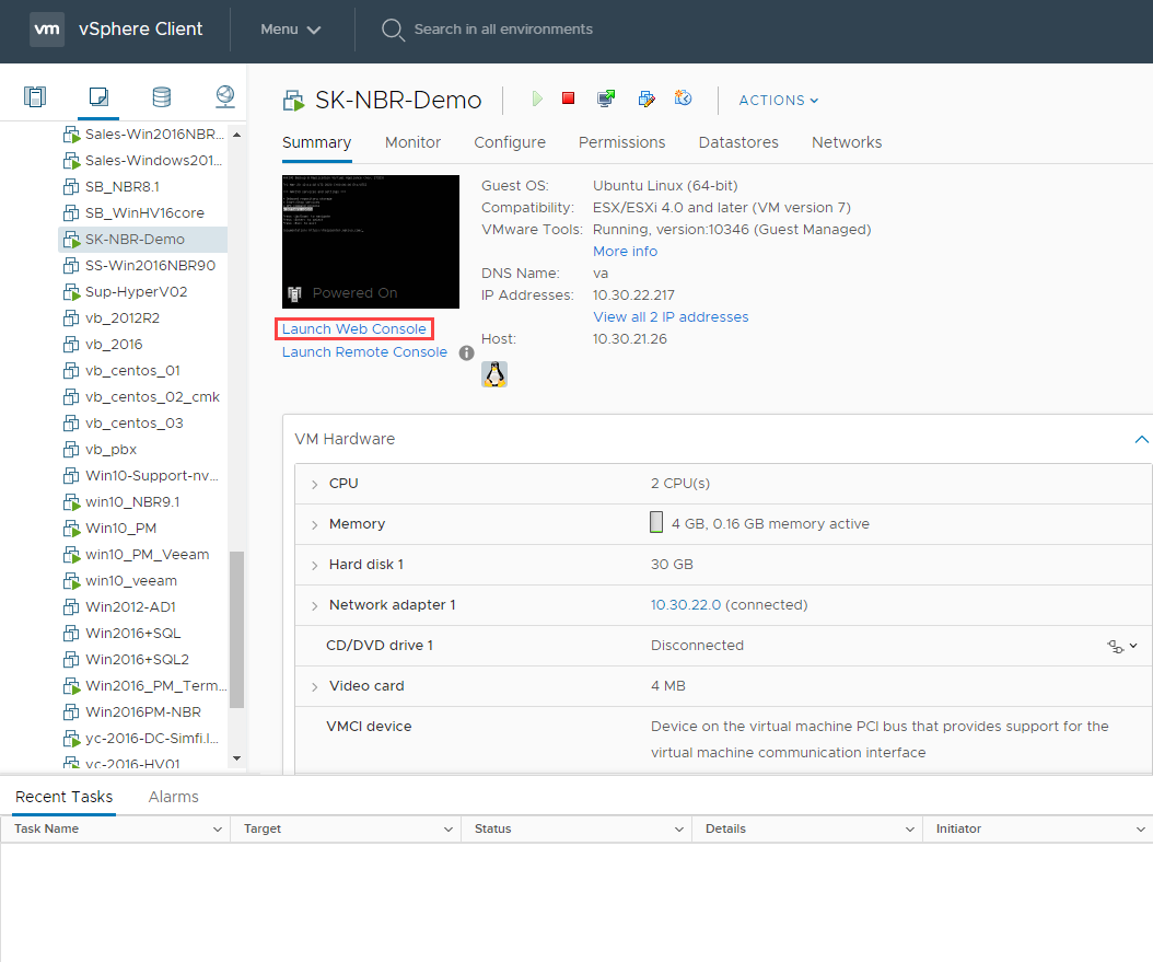 Inicie sesión en su cliente vSphere, navegue hasta su VA y haga clic en Launch Web Console.