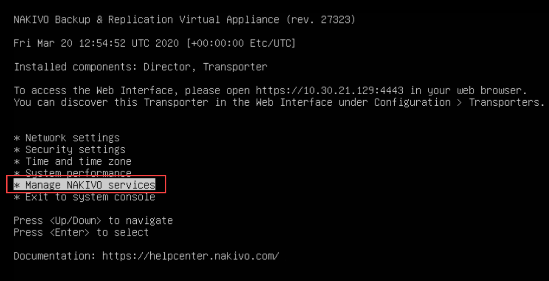 En el menú VA, seleccione Gestionar los servicios NAKIVO y pulse Intro.