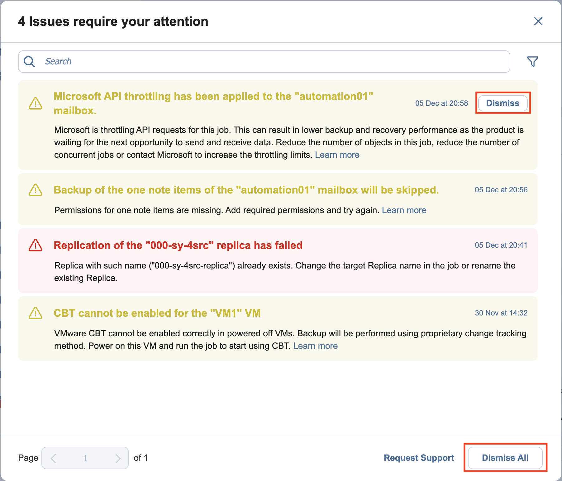 Para descartar todas las alarmas y notificaciones de un job o grupo seleccionado, haga clic en Descartar todo. Para descartar una alarma o notificación individual, sitúe el puntero del ratón sobre la alarma o notificación y haga clic en Descartar.