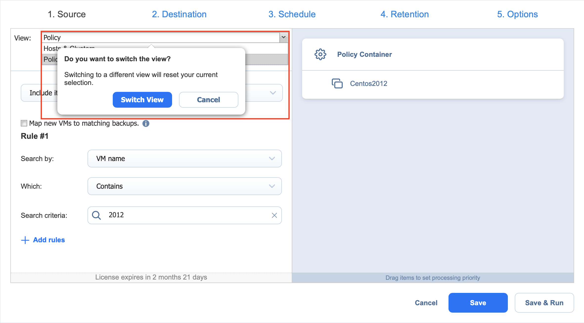 Con las políticas, puede crear reglas que añadan fácilmente elementos coincidentes a los jobs de backup de NAKIVO & Replication. Por ejemplo, puede crear un job de backups que cumpla los siguientes criterios: (a) el tamaño de la máquina virtual es superior a 4 GB, (b) el número de zócalos de CPU de la máquina virtual es superior a 2 y (c) el nombre de la máquina virtual contiene "Ubuntu". Cualquier política se aplica a un solo job. En el asistente de trabajos de NAKIVO Backup & Replication, la política de job es accesible desde la vista Policy de la página Source.