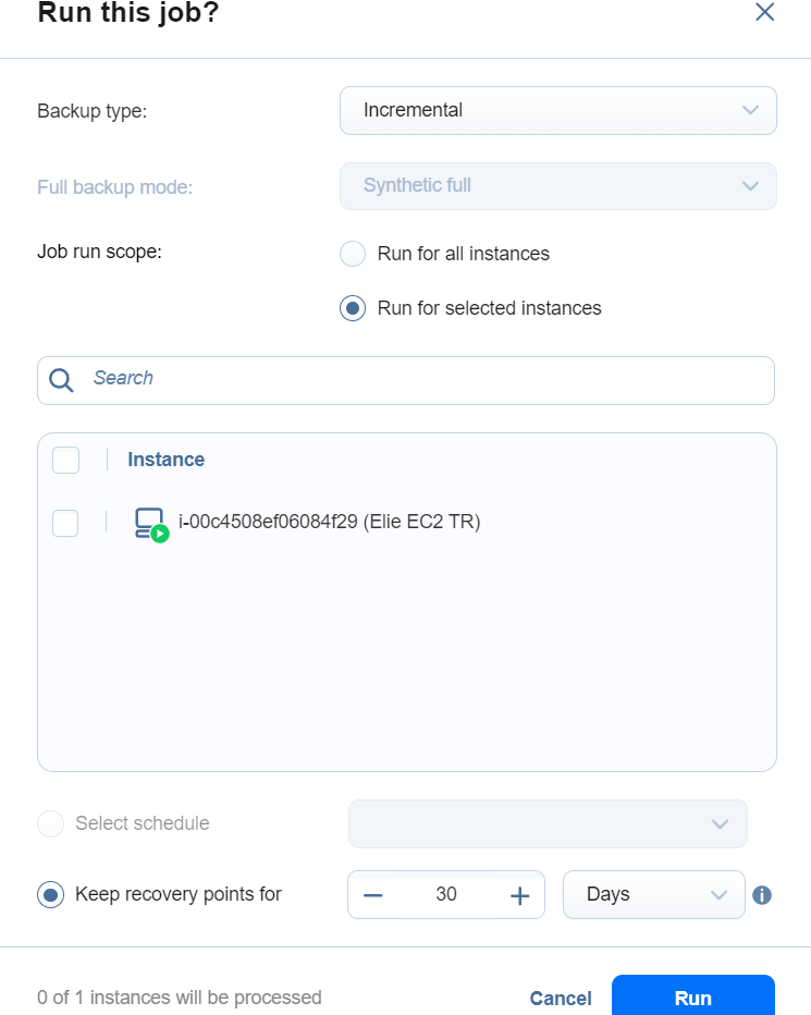 Seleccione Programación: Seleccione esta opción para elegir una programación preconfigurada y sus ajustes de retención para este job. Si una ejecución anterior de este job se detuvo o falló, los ajustes utilizados para esa ejecución se seleccionan por defecto. A los puntos de recuperación creados por un job ejecutado manualmente con esta opción se les asignan automáticamente fechas de caducidad.