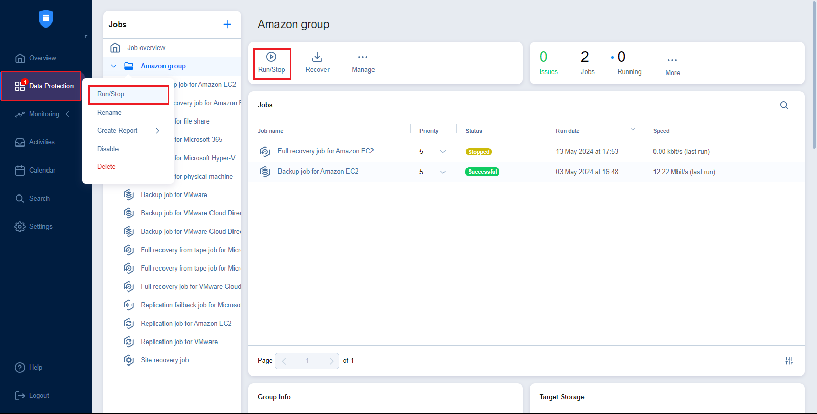De el menú Protección de datos, seleccione el grupo de jobs necesario y haga clic en Ejecutar/Parar. Para gestionar todos los jobs y grupos a la vez, seleccione Resumen y haga clic en Ejecutar/Parar. Como alternativa, haga clic con el botón derecho en el grupo de jobs necesario para abrir el menú de acciones y haga clic en Ejecutar/Parar.