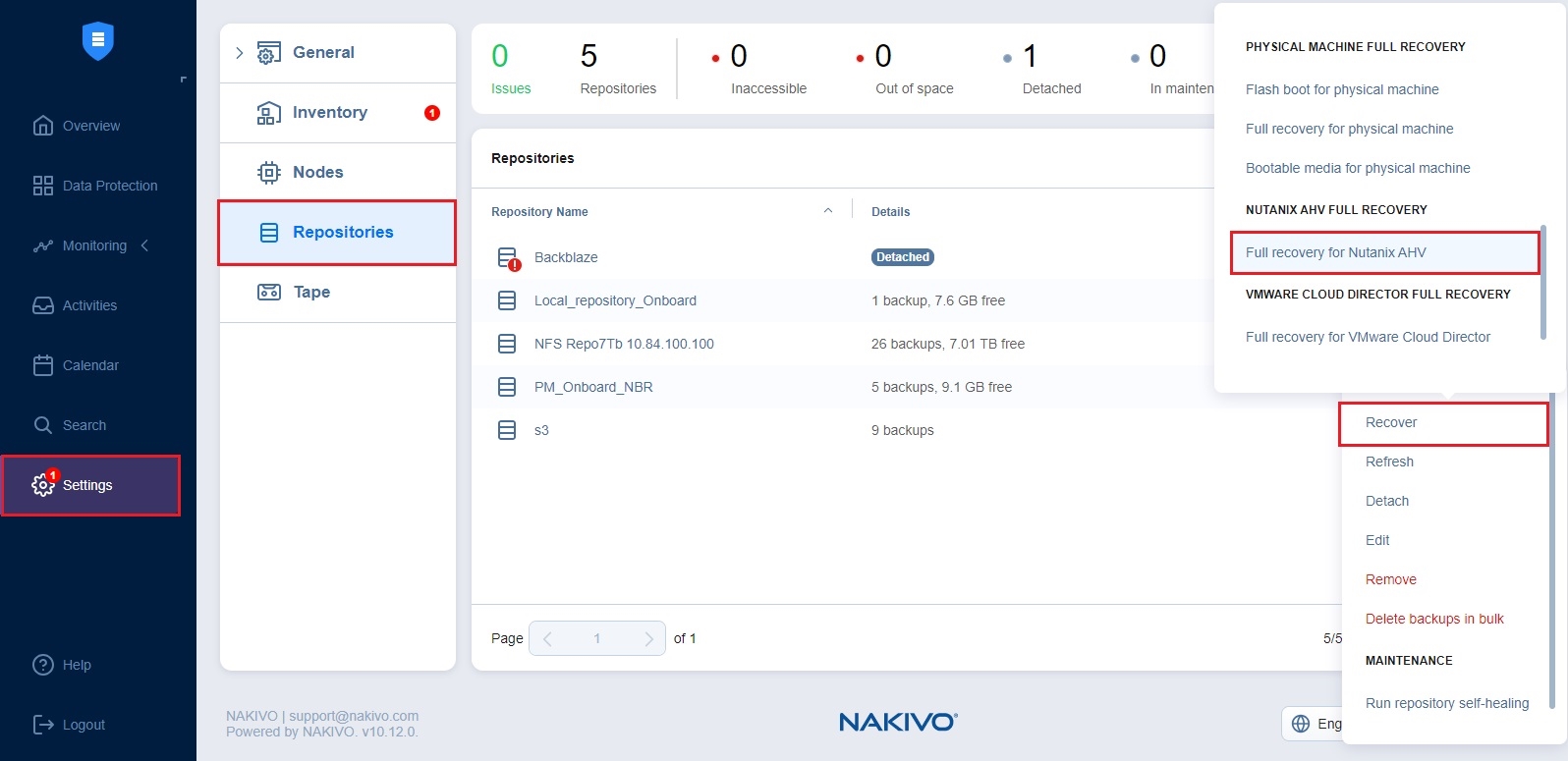 Inicie la recuperación desde el menú Protección de datos haciendo clic en Recuperar y, a continuación, en Recuperación completa para Nutanix AHV en la sección Recuperación completa de Nutanix AHV.