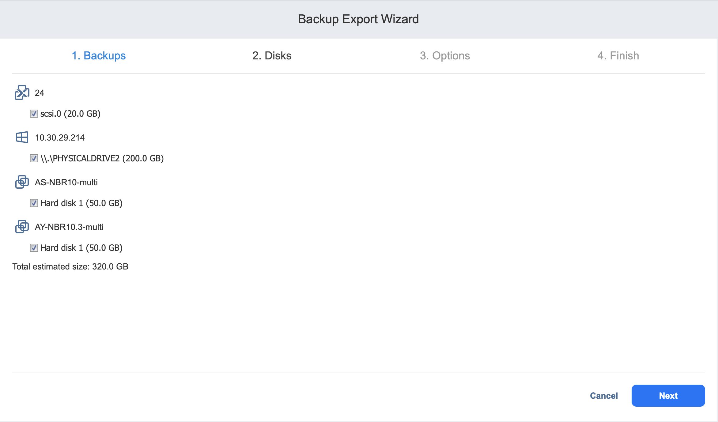 Seleccione uno o más discos en cada backups.