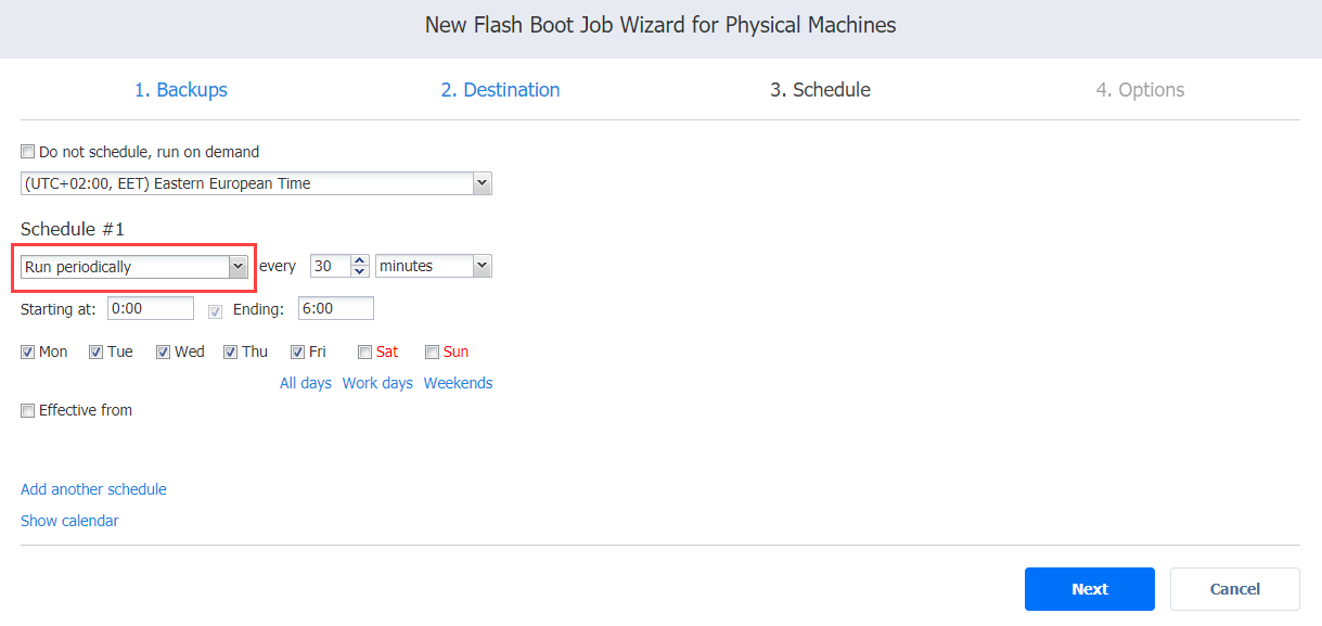 En la página Programación del asistente, seleccione ejecutar el job de backups manualmente o programar el job para que se ejecute de forma regular.